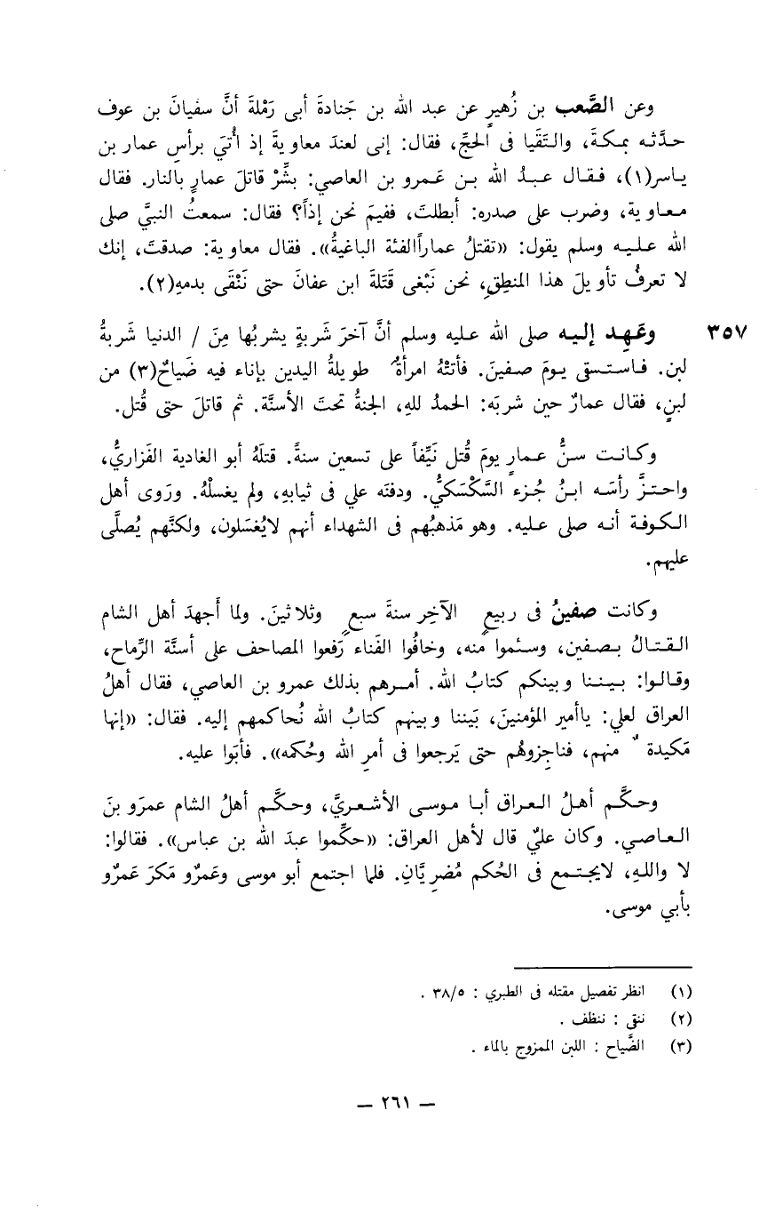 وعن الصَّعب بن زُهير بن عبد الله بن جَنادة أبي رملة أنَّ سفيان بن عوف حدَّثه بمكة، والتقيا في الحجِّ، فقال: إنَّي لعندَ معاوية إذ أُتي برأس عمار بن ياسر، فقال عبد الله بن عمرو بن العاصي: بشِّر قاتل عمار بالنار. فقال معاوية، وضرب على صدره: أبطلت، ففيهم نحن إذاً؟ فقال: سمعت النبيَّ صلى الله عليه وسلم يقول: " تقتل عمار الفئة الباغية ". فقال معاوية: صدَقْت، إنك لا تعرف تأويل هذا المنطق، نبغي قتلة ابن عفان حتى ننقى بدمه.