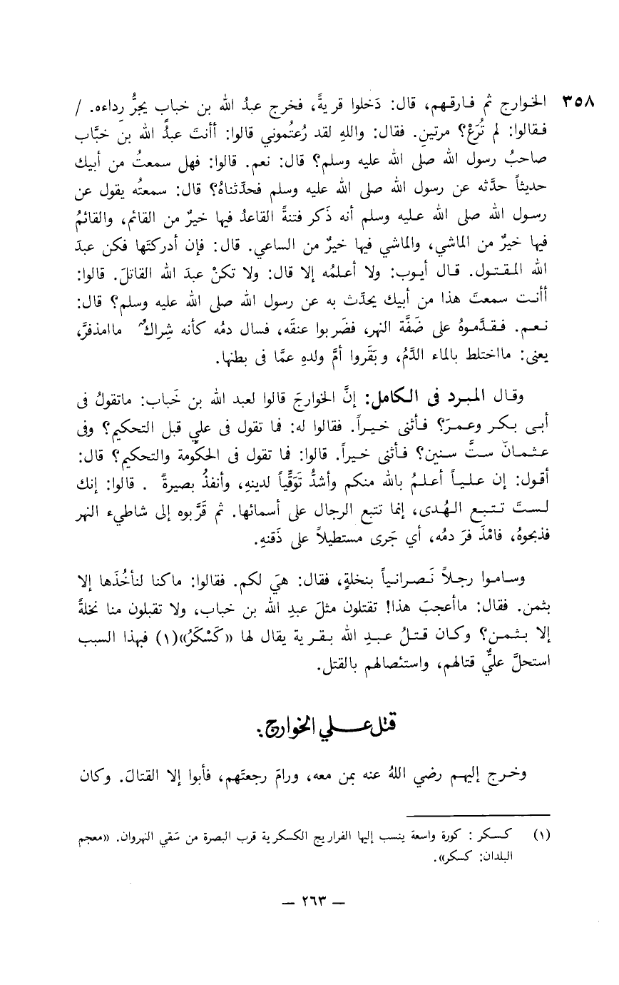 وساموا رجلا نصرانيا بنخلة، فقال: هي لكم. فقالوا: ما كنا لنأخذها إلا بثمن. فقال: ما أعجب هذا! تقتلون مثل عبد الله بن خباب، ولا تقبلون منا نخلة إلا بثمن؟ وكان قتلُ عبد الله بقرية يُقال لها " كَسْكَر " فبهذا السبب استحلَّ عليٌّ قتالهم، واستئصالهم بالقتل.