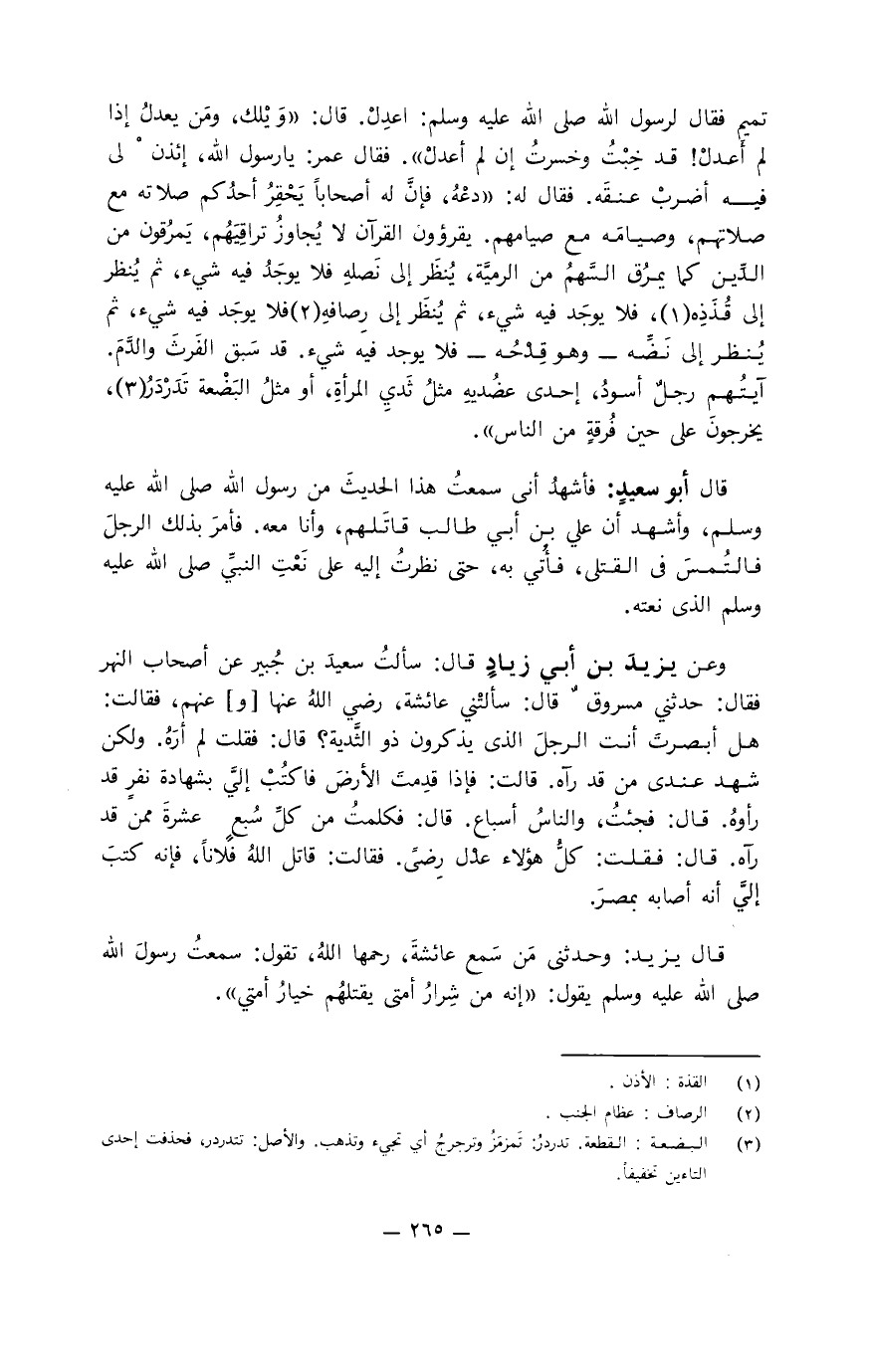 نعيم فقال لرسول الله صلى الله عليه وسلم: أعْدِل. قال: " ويلك، ومَن يعدل إذا لم أعدِل! قد خِبتُ وخسِرتُ إن لم أعدِل ". فقال عمر: يا رسول الله، إئذن لي فيه أضرب عنقه. فقال له: " دعه، فإن له أصحابا يحقِر أحدكم صلاته مع صلاتهم، وصيامه مع صيامهم. يقرؤون القرآن ولا يجاوز تراقيهم، يمرقون من الدِّين كما يمرَق السَّهم من الرميَّة، ينظر إلى نَصله فلا يوجد فيه شيء، ثم يُنظر إلى قُذَذِه، فلا يوجد فيه شيء، ثم يُنظَر إلى رصافه فلا يوجد فيه شيء، ثم يُنظر إلى نَضِّه " وهو قِدْحُه " فلا يوجد فيه شيء. قد سَبَقَ الفَرثَ الدَّمَ. آيتهم رجل أسود، إحدى عضُدَيه مثل ثدي المرأة، أو مثل البَضْعَة، تَدَرْدَرُ، يخرجون على حين فُرقة من الناس ".