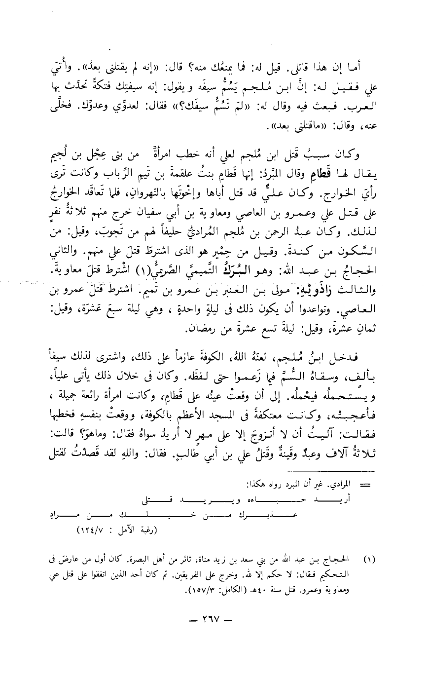فدخل ابن مُلجم، لعنه الله، الكوفة عازما على ذلك، واشترى لذلك سيفا بألف، وسقاه السُّمَّ فيما زعموا حتى لفظه. وكان في خلال ذلك يأتي عليا، ويستحمله فيحمله. إلى أن وقعت عينه على قَطَام، وكانت امرأة رائعة جميلة، فأعجبته، وكانت معتكفة بالمسجد الأعظم بالكوفة، ووقعت بنفسه فخطبها فقالت: آليت أن لا أتزوج إلا على مهر لا أريد سواه فقال: وما هو؟ قالت: ثلاثة آلاف وعبد وقينَةٌ وقَتْلُ علي بن أبي طالب. فقال: والله قصدتُ لقتل