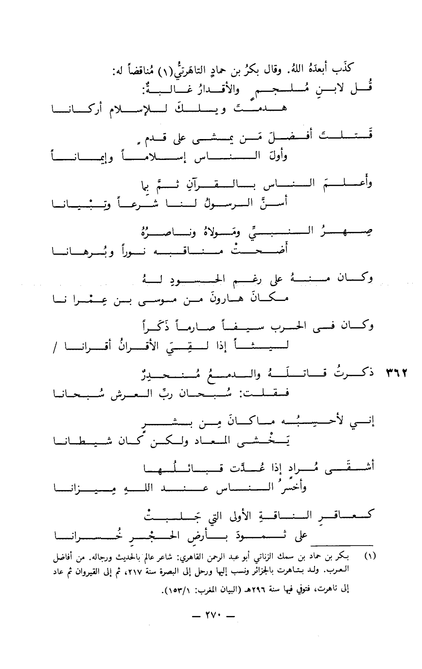 كَذَبَ أبعده الله. وقال بكر بن حماد التاهرتيُّ مناهضا له: