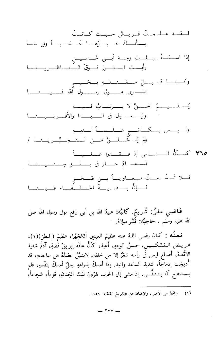 قاضي عليِّ: شُرَيح. كاتبه: عبيد الله بن أبي رافع مولى رسول الله صلى الله عليه وسلم. حاجبه: قُنْبُر مولاه.