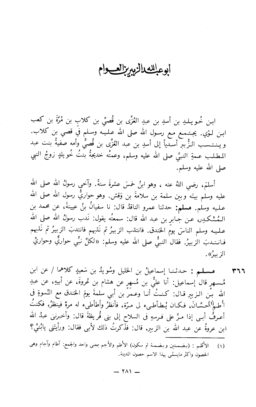 مسلم: حدثنا إسماعيل بن الخليل وسويد بن سعيد كلاهما عن ابن مُسهِر قال إسماعيل: نا عليُّ بن مُسهر عن هشام بن عروة، عن أبيه، عن عبد الله بتن الزبير قال: كنت أنا وعمر بن أبي سلمة يوم الخندق مع النِّسوة في أطمِ حسَّان، فكان يُطاطئ لي مرة فينظر كنت أعرف أبي إذا مرَّ على فرسه في السلاح إلى بني قريظة قال: وأخبرني عبد الله بن عروة عن عبد الله بن الزبير، قال: فذكرت ذلك لأبي فقال: ورأيتني يا بُنَيِّ؟