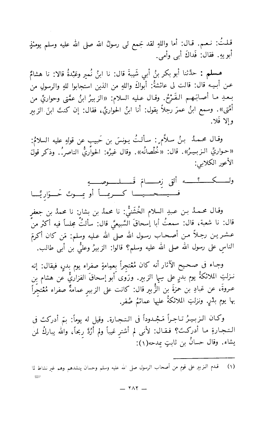 مسلم: حدَّثنا أبو بكر بن أبي شيبة قال: نا ابن نُمَير وعبدة قالا: نا هشام عن أبيه قال: قالت لي عائشة: أبوك والله من الذين استجابوا لله والرسول من بعد ما أصابهم القرح. وقال عليه السلام: " الزبير ابن عمَّتي وحواريِّ من أُمَّتي ". وسمع ابن عمر رجلا يقول: أنا ابن الحواريِّ، فقال: إن كنت ابن الزبير وإلا فلا.