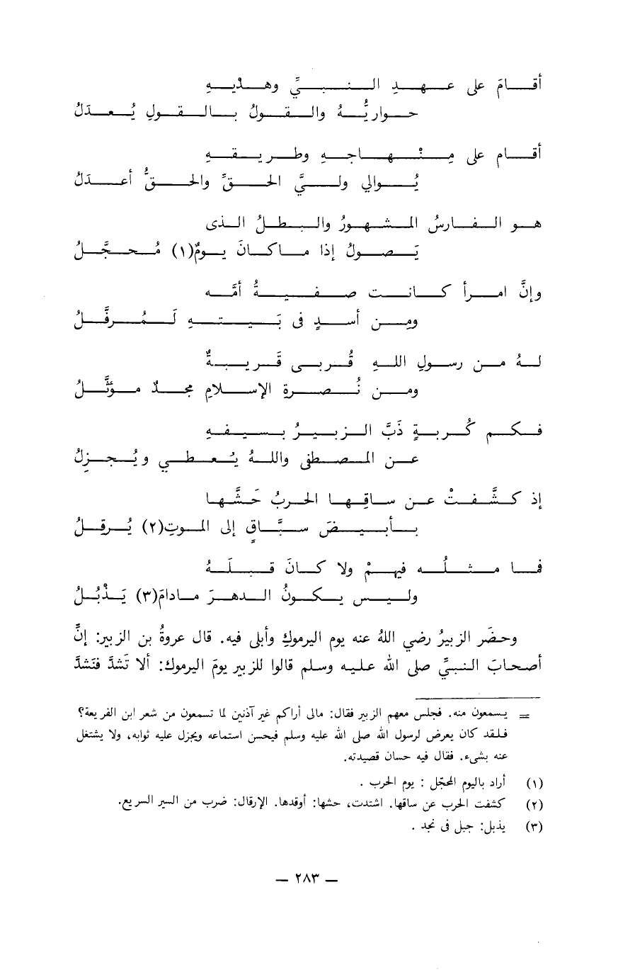 فكم كُربةٍ ذَبَّ الزبيرُ بسيفهِ ... عن المصطفى واللهُ يُعطي ويُجزِلُ