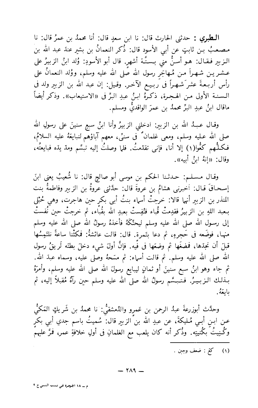 الطبري: حدثني الحارث قال: نا ابن سعد قال: أنا محمد بن عمر قال: نا مصعب بن ثابت عن أبي الأسود قال: ذُكر النعمان بن بشير عند عبد الله بن الزبير فقال: هو أسنُّ مني بستَّة أشهر. قال أبو الأسود: وُلد ابن الزبير على عشرين شهرا من مُهاجر رسول الله صلى الله عليه وسلم، وولد النعمان على رأس أربعة عشر شهرا في ربيع الآخر. وقيل: إن عبد الله بن الزبير ولد في السنة الأولى من الهجرة، ذكره ابن عبد البرِّ في " الاستيعاب ". وذكر أيضا ما قال ابن البرِّ محمد بن عمر الواقديُّ ومسلم.