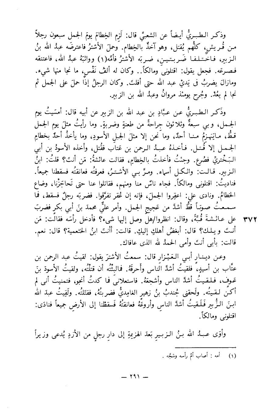 وذكر الطبريُّ أيضا عن الشعبيِّ قال: لزم الخطام يوم الجمل سبعون رجلا من قريش، كلهُّم يقتل، وهو أخذ بالخطام. وحمل الأشتر فاعترض عبد الله بن الزبير، فاختلفا ضربتين، ضربه الأشتر فأمَّه وواثبه عبد الله، فاعتنقه فصرعه. فجعل يقول: اقتلوني ومالكا.. وكان له ألف نفس، ما نجا منها شيء. وما زال يضرب في يدي عبد الله حتى أفلت. وكان الرجل إذا حمل على الجمل ثم نجا لم يعد. وجرح يومئذ مروان وعبد الله بن الزبير.