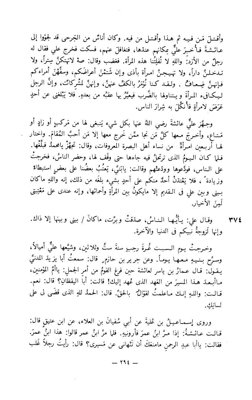 وأقتل من فيه ثم هذا وأقتل من فيه. وكان أناس من الجرحى قد لجؤوا إلى عائشة فأخبر عليٌّ بمكانهم عندها، فتغافل عنهم، فسكت فخرج علي فقال له رجل من الأزد: والله لا تُفلِتُنا هذه الرأة. فغضب وقال: صه لاتهتكنَّ سترا، ولا تدخلنَّ دارا، ولا تهيجنَّ امرأة بأذى وإن شتمن أعراضكم، وسفَّهن أمراءكم فإنهنَّ ضعاف. ولقد كنا نُؤمر بالكفِّ عنهنَّ، وإنهنَّ لمشركات، وإنَّ الرجل ليكافئ المرأة ويتناولها بالضَّرب فيغيَّرُ بها عقبة من بعده. فلا يَبْلغني عن أحد عَرَضَ لا مرأة فأُنكِّلَ به شَرار الناس.