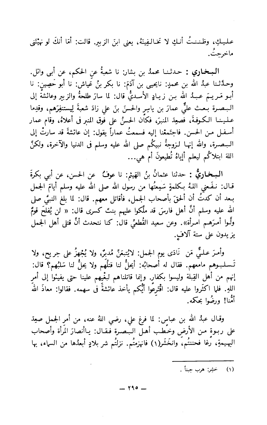 البخاريُّ: حدثنا عثمان بن الهيثم: نا عوف عن الحسن، عن أبي بكرة قال: نفعني الله بكلمة سمعتها من رسول الله صلى الله عليه وسلم أيام الجمل بعد أن كدت أن ألحق بأصحاب الجمل، فأقاتل معهم. قال: لما بلغ النبيَّ صلى الله عليه وسلم أنَّ أهل فارس قد ملَّكوا عليهم بنت كسرى قال: " لن يُفلح قوم ولَّوا أمرهم امرأة ". وعن سعيد القُطعيِّ قال: كنا نتحدث أنَّ قتلى أهل الجمل يزيدون على ستة آلاف.
