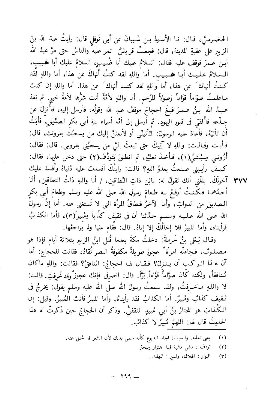 الحضرميَّ، قال: نا الأسود بن شَيبان عن أبي نوفل قال: رأيت عبد الله بن الزبير على عقبة المدينة، قال: فجعلت قريش تمر عليه والناس حتى مرَّ عبد الله ابن عمر فوقف عليه فقال: السلام عليك أبا ضُبيب، السلام عليك أبا ضبيب، السلامُ عليك أبا ضبيب. أما والله لقد كنت أنهاك عن هذا، أما والله لقد كنت أنهاك عن هذا، أما والله لقد كنت أنهاك عن هذا. أما والله إن كنت ماعملت صوّاما قوَّاما وصولا للرَّحم. أما والله لأمَّة أنت شرُّها لأمة خير. ثم نفذ عبدُ الله بن عمر فبلغ الحجاج موقف عبد الله وقوله، فأرسل إليه، فأنزل عن جذعه فألقي في قبور اليهود. ثم أرسل إلى أمَّه أسماء بنة أبي بكر الصدِّيق، فأبت أن تأتيهُ، فأعاد عليه الرسول: لتأتينِّي أو لأبعثن إليك من يسحبُك بقرونك، قال: فأبت وقالت: والله لا آتيك حتى تبعث إليَّ من يسحبُني بقروني. قال: فقال: أرُوني سِبْتَيَّ، فأخذ نعليه، ثم انطلق يَتَوذَّف حتى دخل عليها، فقال: كيف رأيتني صنعتُ بعدوِّ الله؟ قالت: رأيتُك أفسدت عليه دُنياهُ وأفسد عليك آخرتك. بلغَني أنك يقول له: يابن ذات النِّطاقين، أنا والله ذات النطاقين، أمَّا أحدهما فكنت أرفع به طعام رسول الله صلى الله عليه وسلم وطعام أبي بكر الصديق من الدوابِّ، وأما الآخر فنطاق المرأة التي لا تستغني عنه. أما إنَّ رسول الله صلى الله عليه وسلم حدَّثنا أن في ثقيف كذَّابا ومبيرا، فأما الكذاب فرأيناه، وأما المبير فلا إخالك إلا إياه. قال: فقام عنها ولم يراجعها.