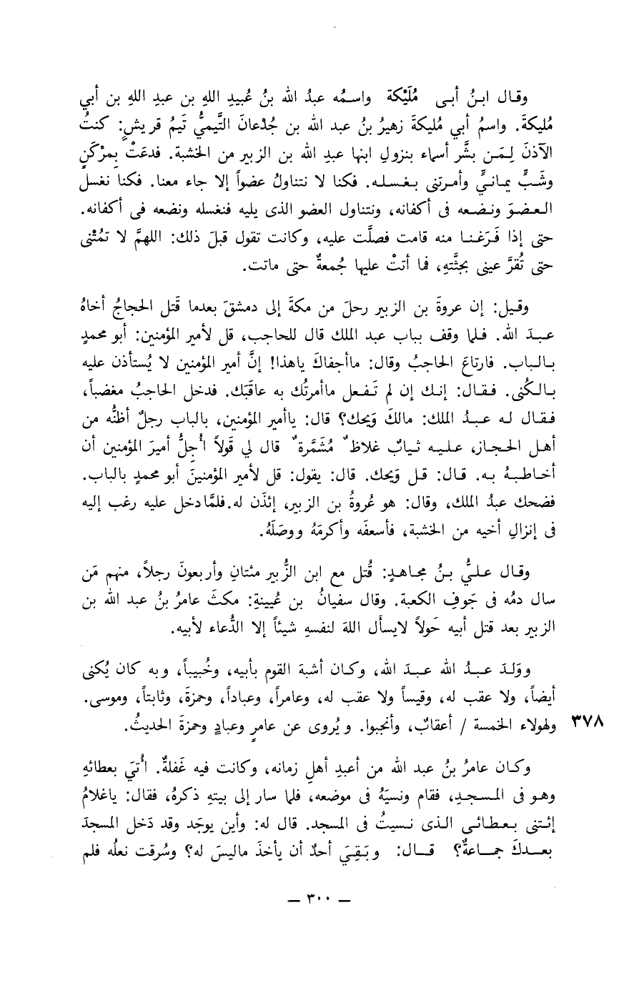 وقال عليُّ بن مجاهد: قُتل مع ابن الزُّبير مئتان وأربعون رجلا، منهم من سال دمه في جوف الكعبة. وقال سفيان بن عُيينة: مكث عامر بن عبد الله بن الزبير بعد قتل أبيه حولا لا يسأل الله لنفسه شيئا إلا الدُّعاء لأبيه.