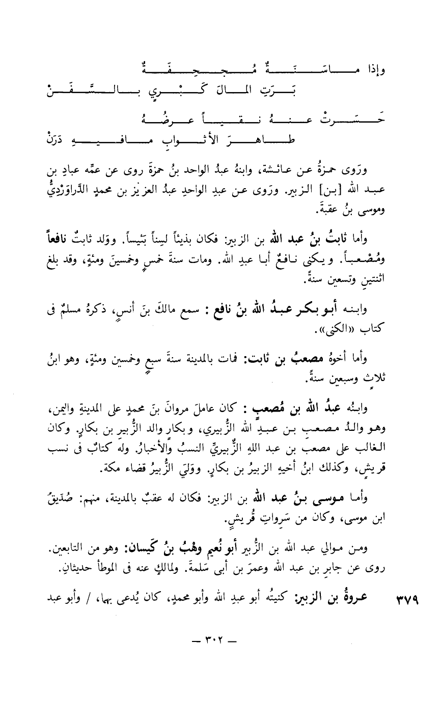 وأما ثابتُ بن عبد الله بن الزبير: فكان بذيئاً لسِنا بئيساً. وولد ثابت نافعا ومُصْعبا. ويكنى نافع أبا عبد الله. ومات سنة خمس وخمسين ومئة، وقد بلغ اثنتين وتسعين سنة.