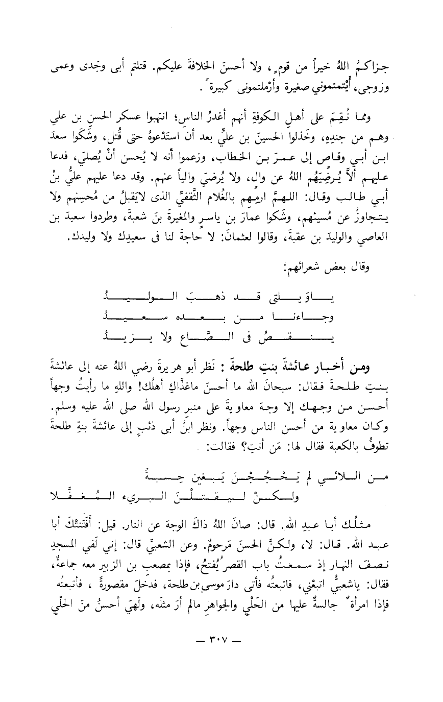 مثلك أبا عبد الله. قال: صان الله ذاك الوجه عن النار. قيل: أفَتَنتْك أبا عبد الله. قال: لا، ولكنَّ الحسن مرحوم. وعن الشعبيِّ قال: إني لفي المسجد نصف النهار إذ سمعت باب القصر يُفتح، فإذا بمصعب بن الزبير معه جماعة، فقال: يا شعبيُّ اتبعني، فاتبعته فأتى دار موسى بن طلحة، فدخل مقصورة، فأتبعته فإذا امرأة جالسة عليها من الحلي والجواهر مالم أر مثله، ولهي أحسن من الحلي
