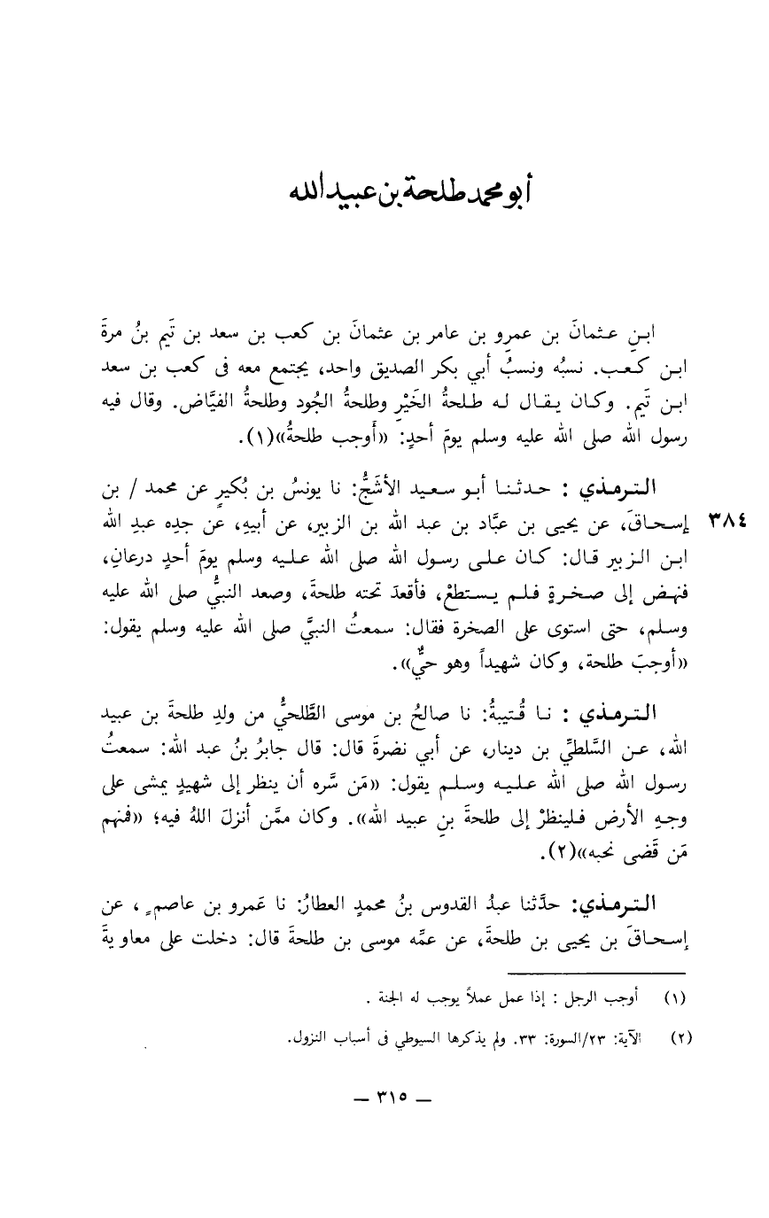 الترمذي: نا قُتيبة: نا صالح بن موسى الطَّلحيُّ من ولد بن عبيد الله، عن السَّلطيِّ بن دينار، عن أبي نضرة قال: قال جابر بن عبد الله: سمعت رسول الله صلى الله عليه وسلم يقول " " من سَّره أن ينظر إلى شهيد يمشي على وجه الأرض فلينظر طلحة بن عبيد الله ". وكان ممَّن أنزل الله فيه؛ " فمنهم مَن قَضى نحبه ".