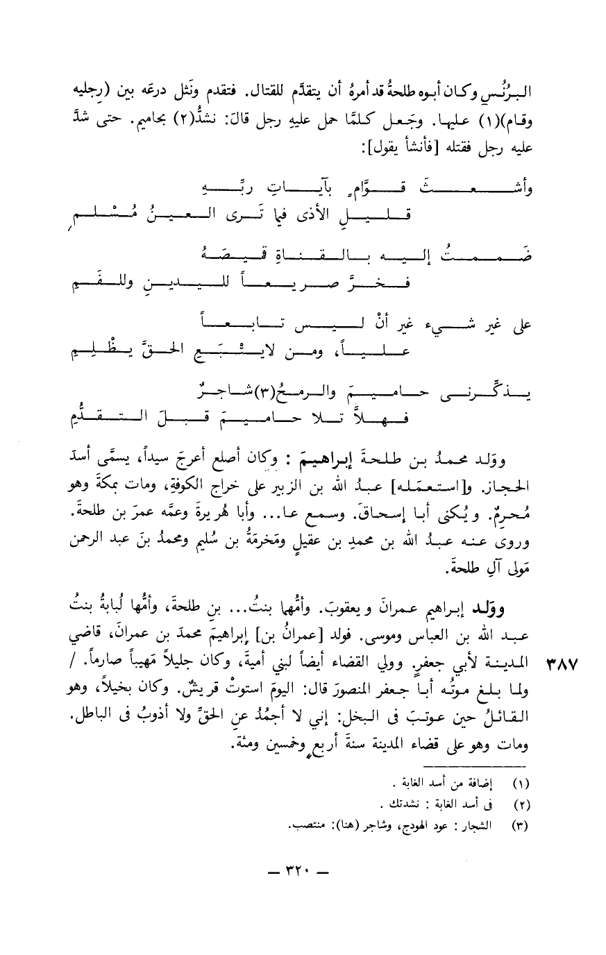 البرُنُسِ وكان أبوه طلحة قد أمره أن يتقدَّم للقتال. فتقدم ونثل درعه بين " رجليه وقام " عليها. وجعل كلمَّا حمل عليه رجل قال: نشدُّ بحاميم. حتى شدَّ عليه رجل فقتله " فأنشأ يقول ":