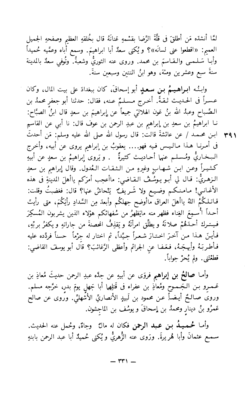 وابنه إبراهيم بن سعد أبو إسحاق، كان ببغداد على بيت المال، وكان عسراً في الحديث ثقةً. أخرج مسلم عنه، فقال: حدثنا أبو جعفر محمد بن الصَّباح وعبد الله بن عون الهلالي جميعاً عن إبراهيم بن سعد قال ابنُ الصَّباح: نا إبراهيم بن سعد بن إبراهيم بن عبد الرحمن بن عوف قال: نا أبي عن القاسم بن محمد عن عائشة قالت: قال رسول الله صلى الله عليه وسلم: من أحدث في أمرنا هذا ما ليس فيه فهو.... يعقوب بن إبراهيم يروي عن أبيه، وأخرج البخاريُّ ومُسلم عنهما أحاديث كثيرة. ويروى إبراهيم بن سعد عن أبيه كثيراً وعن ابن شهاب وغيره من الثقات العُدول. وقال إبراهيم بن سعد الزهريُّ: قال لي أبو يوسُف القاضي: ما أعجب أمركم يا أهل المدينة في هذه الأغاني! ما منكم وضيع ولا شريف ينحاش عنها؟ قال: فغضبتُ وقلت: أحداً أُسمع الغِناء فظهر منه ما يَظهرُ من سُفهائكم هؤلاء الذين يشربون المُسكِرَ فيترك أحدهُم صلاته ويطلِّق امرأتَهُ ويَقذف المحصنة من جاراته ويكفرُ بربِّه، فأين هذا من آخر اختار شعراً جيداً، ثم اختار له جِرماً حسناً فردَّده عليه فأطربَهُ وأبهجَهُ، فعفا عن الجرائم وأعطى الرَّغائب؟ قال أبو يوسف القاضي: قطعتني. ولم يُحرْ جواباً.