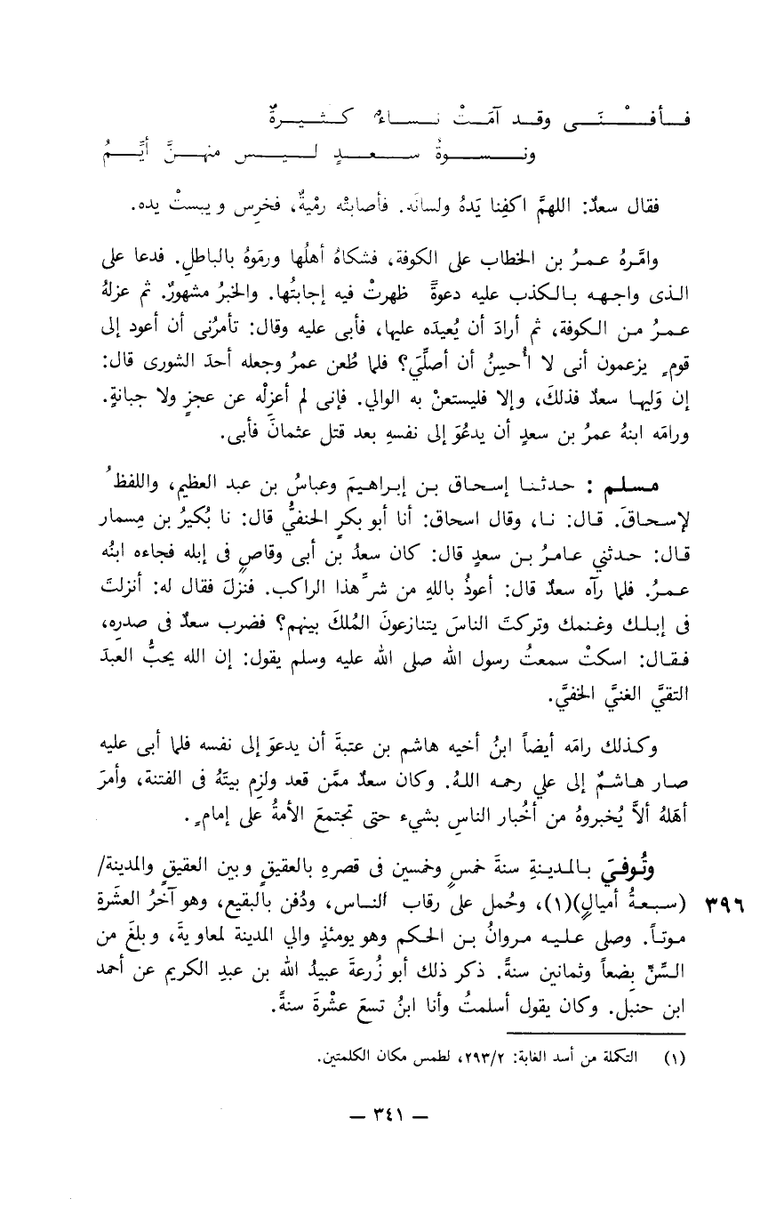 مسلم: حدثنا إسحاق بن إبراهيم وعباس بن عبد العظيم، واللفظ إسحاق. قال: نا، وقال إسحاق: أنا أبو بكر الحنفيُّ قال: نا بُكير بن مسمار قال: حدثني عامر بن سعد قال: كان سعد بن أبي وقاص في إبله فجاءه ابنه عمر. فلما رآه سعد قال: أعوذ بالله من شر هذا الراكب. فنزل فقال له: أنزلت في إبلك وغنمك وتركت الناس يتنازعون المُلك بينهم؟ فضرب سعد في صدره، فقال: اسكت سمعت رسول الله صلى الله عليه وسلم يقول: إن الله يحبُّ العبد التقيَّ الغنيَّ الخفيَّ.