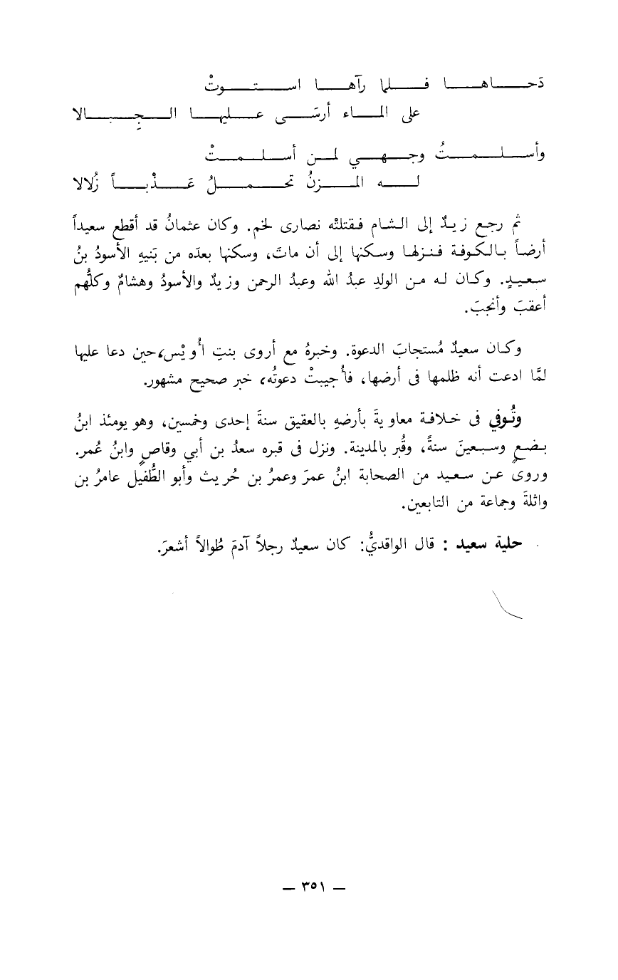 حلية سعيد: قال الواقديُّ: كان سعيد رجلاً آدم طُوالاً أشعر.