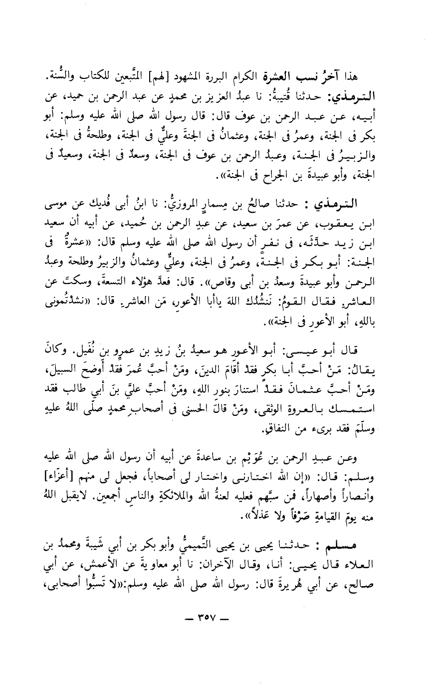 هذا آخر نسب العشرة الكرام البررة المشهود " لهم " المتَّبعين للكتاب والسُّنة. الترمذي: حدثنا قُتيبةُ: نا العزيز بن محمد عن عبد الرحمن بن حميد، عن أبية، عن عبد الرحمن بن عوف قال: قال رسول الله صلى الله عليه وسلم: أبو بكر في الجنة، وعمر في الجنة، وعثمان في الجنة وعليٌّ في الجنة، وطلحة في الجنة، والزبير في الجنة، وعبد الرحمن بن عوف في الجنة، وسعد في الجنة، وسعيد في الجنة، وأبو عبيدة بن الجراح في الجنة ".