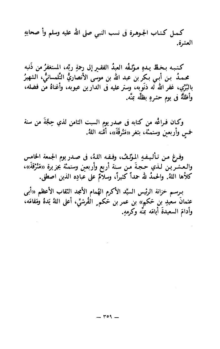 كمل كتاب الجوهرة في نسب النبي صلى الله عليه وسلم وأصحابه العشرة.