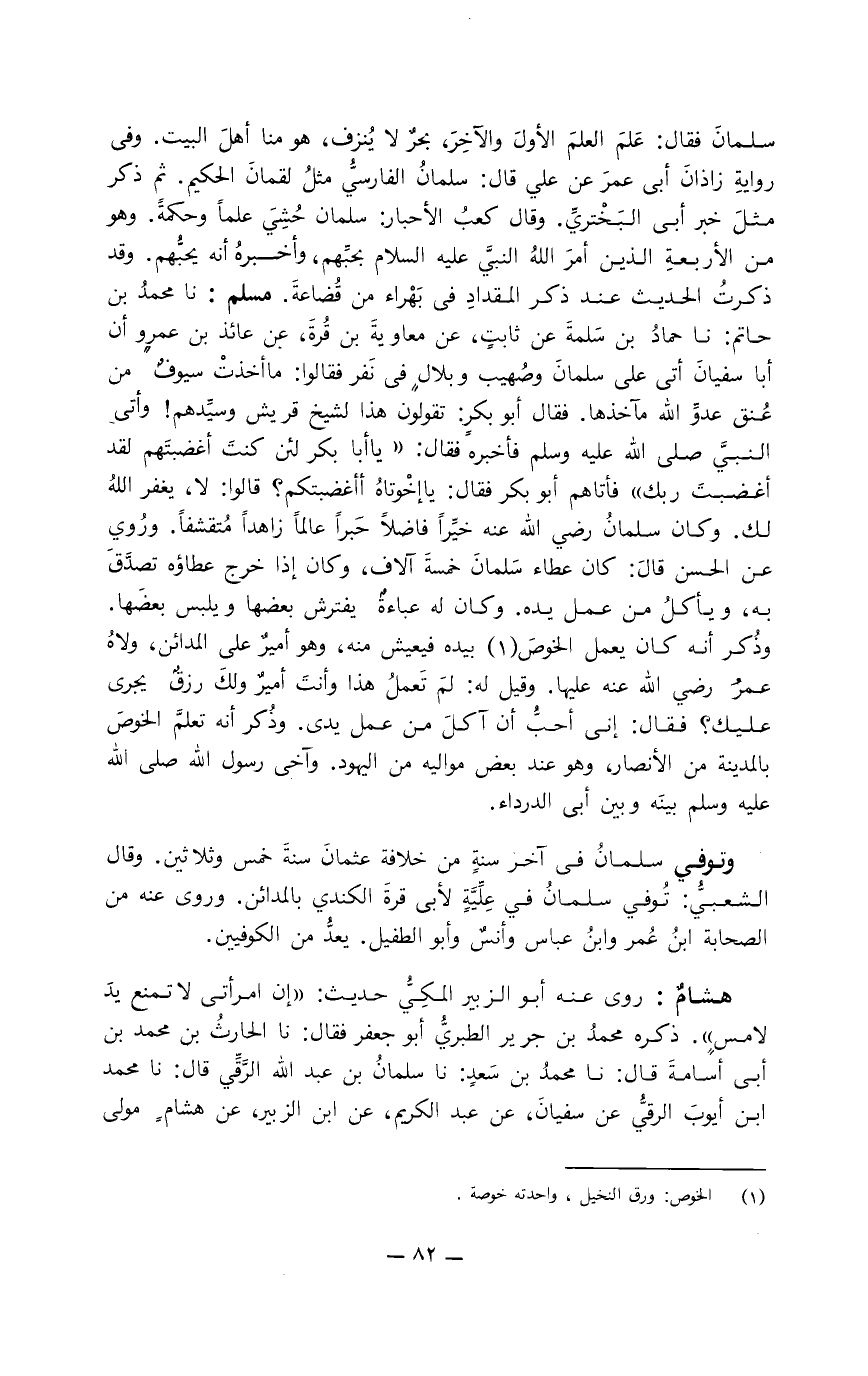 سلمان فقال: عَلمَ العلم الأول والآخر، بحرٌ لا يُنزف، هو منا أهل البيت. وفي رواية زاذان أبي عمر عن علي قال: سلمان الفارسيُّ مثل لقمان الحكيم. ثم ذكر مثل خبر أبي البَخْتريِّ. وقال كعب الأحبار: سلمان حُشي علما وحكمة. وهو من الأربعة الذين أمر الله النبيَّ عليه السلام بحبِّهم، وقد ذكرت الحديث عند ذكر المقداد في بَهْراء من قُضاعة. مسلم: نا محمد بن حاتم: نا حمادُ بن سلمة عن ثابت، عن معاوية بن قرة، عن عائذ بن عمرو أن أبا سفيان أتى على سلمان وصهيب وبلال في نفر فقالوا: ما أخذت سيوف من عنق عدوِّ الله مآخذها. فقال أبو بكر: تقولون هذا لشيخ قريش وسيِّدهم! وأتى النبيَّ صلى الله عليه وسلم فأخبره فقال: " يا أبا بكر لئن كنت أغضبتَهم لقد أغضبتَ ربك " فأتاهم أبو بكر فقال: يا إخوتاه أأغضبتكم؟ قالوا: لا، يغفر الله لك. وكان سلمان رضي الله عنه خيِّرا فاضلا حبرا عالما زاهدا متقشفا. وروي عن الحسن قال: كان عطاء سلمان خمسة آلاف، وكان إذا خرج عطاؤه تصدَّق به، ويأكل من عمل يده. وكان له عباءة يفترش بعضها ويلبس بعضها. وذكر أنه كان يعمل الخوص بيده فيعيش منه، وهو أمير على المدائن، ولاه عمرُ رضي الله عنه عليها. وقيل له: لم تعمل هذا وأنت أمير ولك رزق يجري عليك؟ فقال: إنى أحبُّ أن آكل من عمل يدي. وذكر أنه تعلمَّ الخوص بالمدينة من الأنصار، وهو عند بعض مواليه من اليهود. وآخى رسول الله صلى الله عليه وسلم بينه وبين أبي الدرداء.