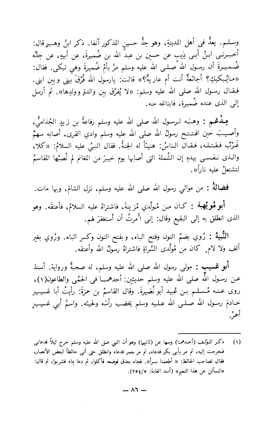 النُّبيهُ: روي بضمِّ النون وفتح الباء، وبفتح النون وكسر الباء. وروي بغير ألف ولا لام كان من مولَّدي السَّراة فاشتراه رسول الله وأعتقه.