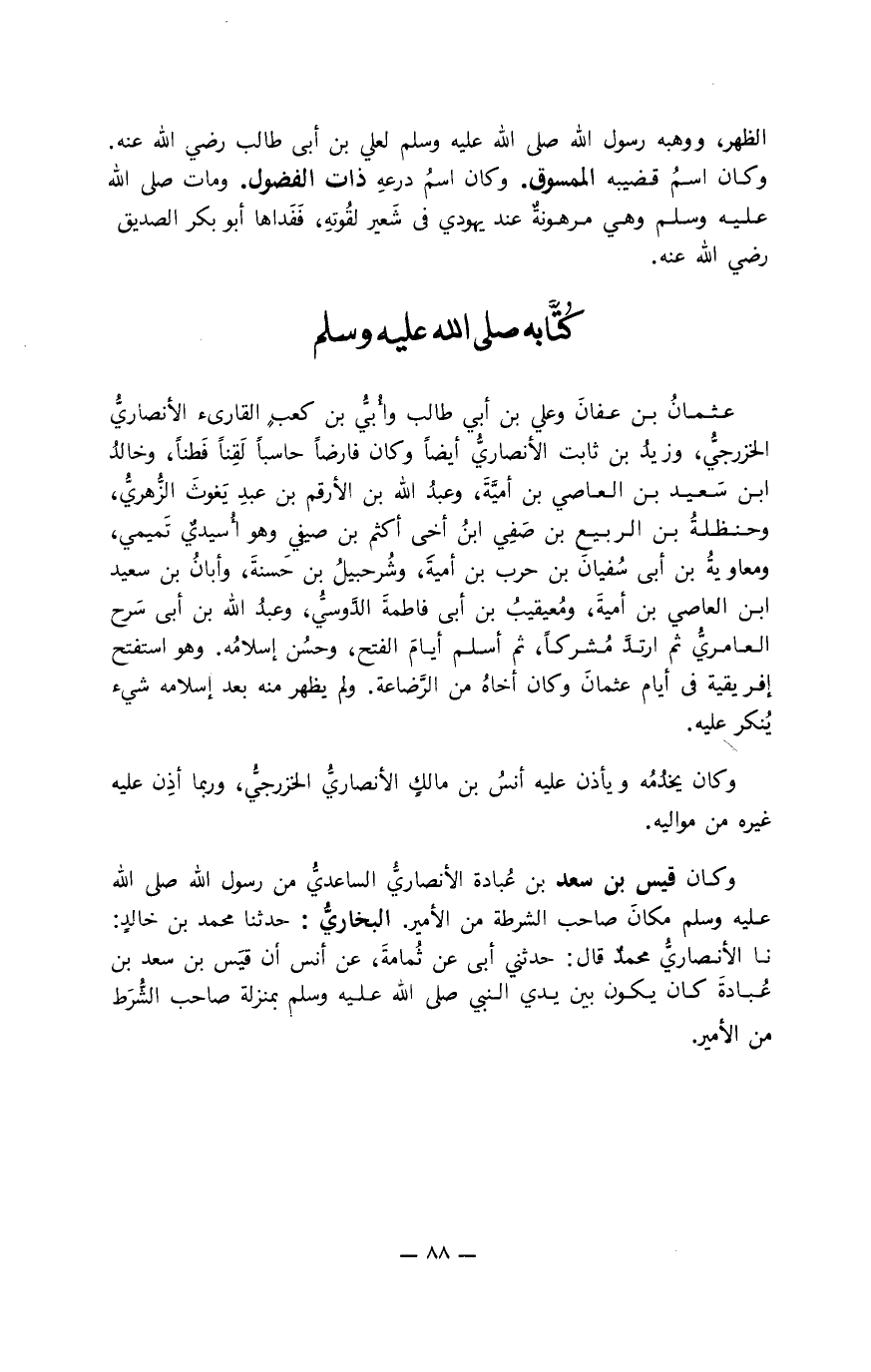 وكان قيس بن سعد بن عُبادة الأنصاريُّ الساعديُّ من رسول الله صلى الله عليه وسلم مكان صاحب الشرطة من الأمير. البخاري: حدثنا محمد بن خالد: نا الأنصاريُّ محمد قال: حدثني أبي عن ثُمامة، عن أنَس أن قيس بن سعد بن عُبادة كان يكون بين يدي النبي صلى الله عليه وسلم بمنزلة صاحب الشُّرَط من الأمير.