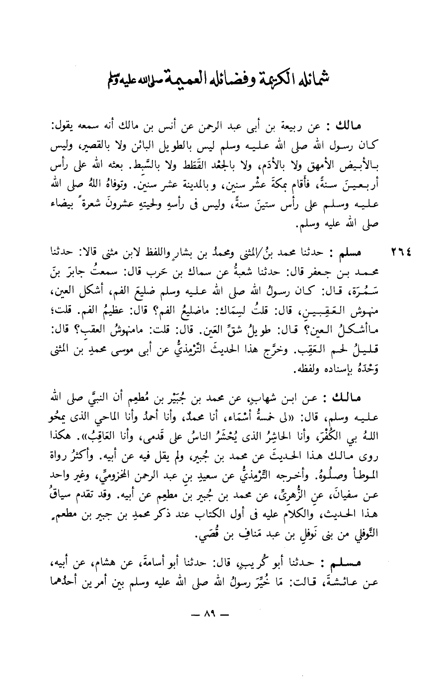 مسلم: حدثنا محمد بن المثنى ومحمد بن بشار واللفظ لابن مثنى قالا: حدثنا محمد بن جعفر قال: حدثنا شُعبة عن سماك بن حرب قال: سمعت جابر بن سَمُرَة، قال: كان رسول الله صلى الله عليه وسلم ضليع الفم، أشكل العين، منهوش العَقِبين، قال: قلتُ لسِمَاك: ما ضليع الفم؟ قال: عظيم الفم. قلت؛ وما أشكل العين؟ قال: طويل شقِّ العين. قال: قلت: ما منهوش العَقِب؟ قال: قليل لحم العَقِب. وخرَّج هذا الحديث التَّرمذيُّ عن أبي موسى بن محمد بن المثنى وحده بإسناده ولفظه.
