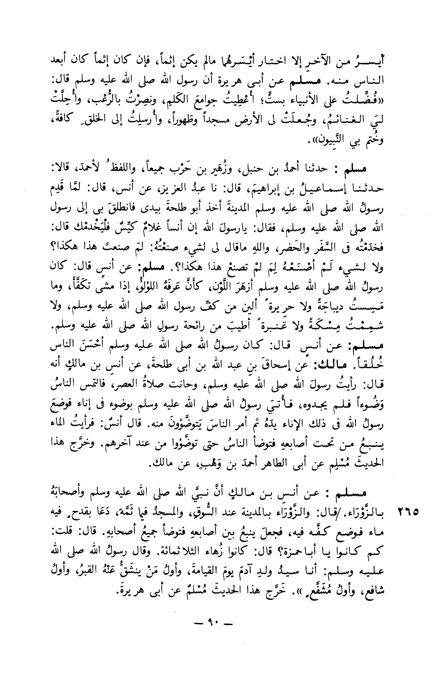 مسلم: عن أنس بن مالك أنَّ نبي الله صلى الله عليه وسلم وأصحابَهُ بالزَّوراء. قال: والزَّوْرَاء بالمدينة عند السُوقِ، والمسجد فيما ثَمَّة، دَعَا بقدح فيه ماء فوضع كفَّة فيه، فجعل ينبعُ بين أصابعهِ فتوضأ جميع أصحابه. قال: قلت: كم كانوا يا أبا حمزة؟ قال: كانوا زهاء الثلاثمائة. وقال رسول الله صلى الله عليه وسلم: أنا سيدُ ولدِ آدم يوم القيامةَ، وأولُ مَنْ ينشقُ عنْهُ القبرُ، وأول شافع، وأول مُشَفَّعٍ (. خَرَّج هذا الحديث مُسلم عن أبي هريرةَ.