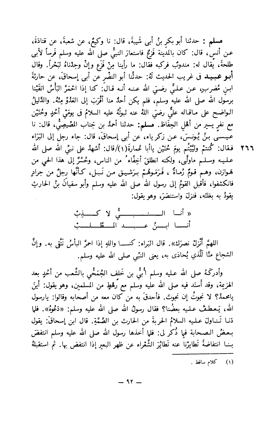 مسلم: حدثنا أبو بكر بن أبي شيبة، قال: نا وكيع، عن شعبة، عن قتادة، عن أنس، قال: كان بالمدينة فزع فاستعار النبيُّ صلى الله عليه وسلم فرسا لأبي طلحة، يقال له: مندوب فركبه فقال: ما رأينا من فَزَع وإن وجدناه لبحرا. وقال أبو عبيد في غريب الحديث له: حدَّثنا أبو النصر عن أبي إسحاق، عن حارثة ابن مُضرب، عن عليٍّ رضي الله عنه أنه قال: كنا إذا احمرَّ البأس اتقينا برسول الله صلى الله عليه وسلم، فلم يكن أحد منا أقرب إلى العدوِّ منه. والدَّليل الواضح على ما قاله عليُّ رضي الله عنه ثبوته عليه السلام في يَومَي أُحُد وحُنَين مع نفر يسير من أهل الحفاظ. مسلم: حدثنا أحمد بن جناب المُصِّيصيُّ، قال: نا عيسى بن يونس، عن زكرياء، عن أبي إسحاق، قال: جاء رجل إلى البراء فقال: كنتُم وُلِّيتُم يوم حُنين يا أبا عُمارة قال: أشهد على نبيِّ الله صلى الله عليه وسلم ما ولِّي، ولكنه انطلق أخِفَّاء من الناس، وحُسَّرٌ إلى هذا الحي من هوازن، وهم قوم رماة، فرموهم برشيق من نبل، كأنَّها رِجلٌ من جراد فانكشفوا، فأقبل القوم إلى رسول الله صلى الله عليه وسلم وأبو سفيان بن الحارث يقود به بغلته، فنز واستنصر، وهو يقول: " أنا النبيُّ لا كذِبْ أنا ابن عبد المطَّلب اللهم أنزل نصرَك ". قال البراء: كنا والله إذا احمرِّ البأسُ نَتَّقي به. وإنَّ الشجاع منَّا للذي يُحاذى به، يعني النبيِّ صلى الله عليه وسلم.