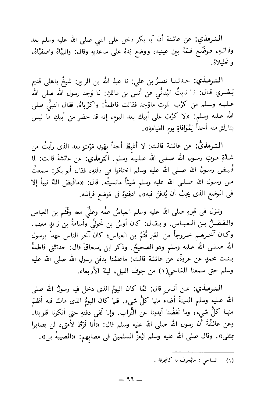الترمذي: عن أنس قال: لمَّا كان اليوم الذي دخل فيه رسول الله صلى الله عليه وسلم المدينة أضاء منها كلَّ شيء. فلما كان اليوم الذي مات فيه أظلم منها كلَّ شيء، وما نفضنا أيدينا من التُّراب. وإنا لفي دفنه حتى أنكرنا قلوبنا. وعن عائشة أن رسول الله صلى الله عليه وسلم قال " أنا فرط لأمَّتي، لن يُصابوا بمثلي ". وقال صلى الله عليه وسلم ليُعزَّ المسلمين في مصابهم: " المصيبة بي ".