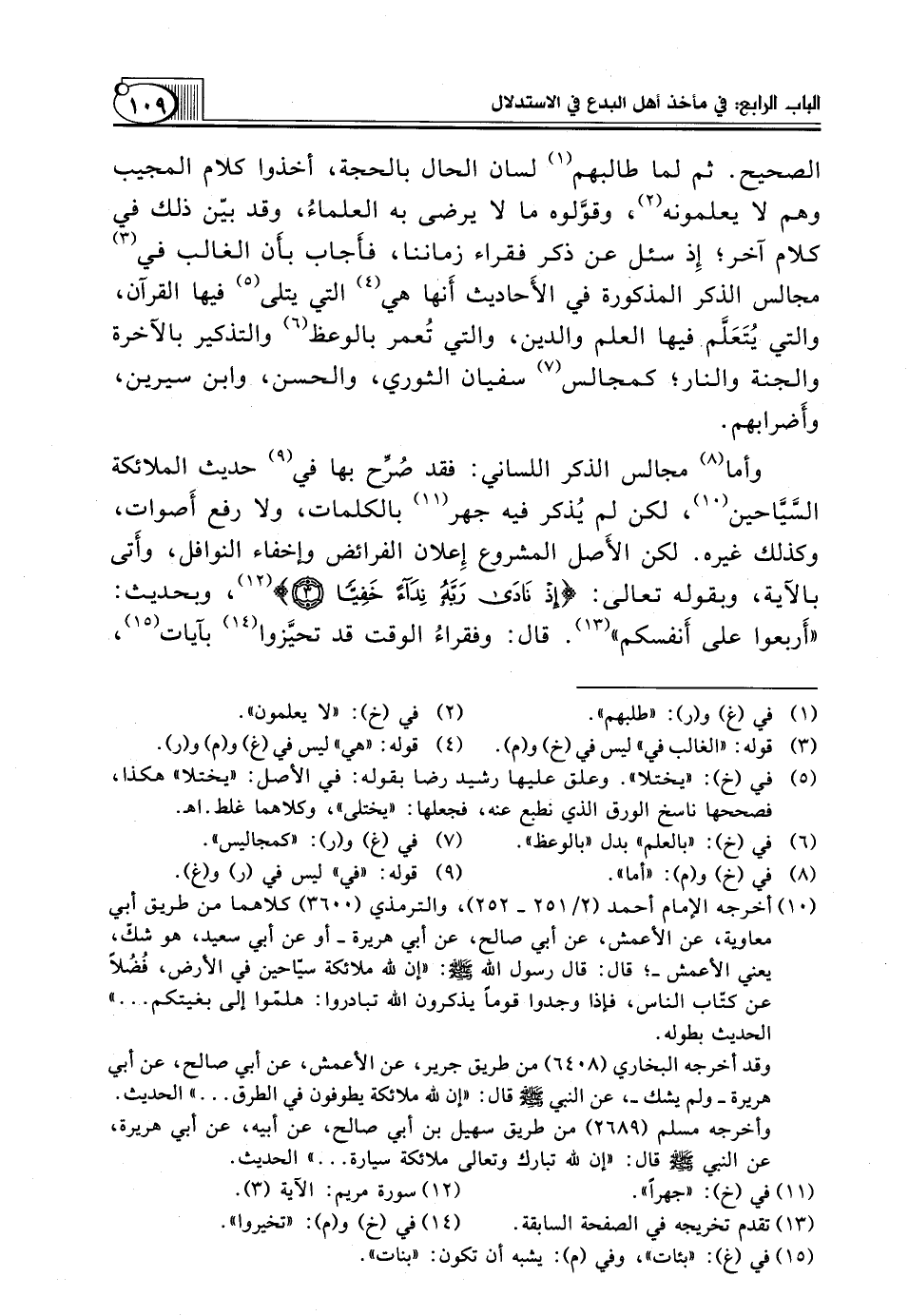 الصَّحِيحِ. ثُمَّ لَمَّا طَالَبَهُمْ (¬1) لِسَانُ الْحَالِ بِالْحُجَّةِ، أخذوا كلام المجيب وهم لا يعلمونه (¬2)، وقوَّلوه مَا لَا يَرْضَى بِهِ العلماءُ، وَقَدْ بَيَّنَ ذَلِكَ فِي كَلَامٍ آخَرَ؛ إِذ سُئِلَ عن ذكر فقراء زماننا، فأَجاب بأَن الغالب في (¬3) مجالس الذكر المذكورة في الأَحاديث أَنها هِيَ (¬4) الَّتِي يُتْلَى (¬5) فِيهَا الْقُرْآنُ، وَالَّتِي يُتَعَلَّم فِيهَا الْعِلْمُ وَالدِّينُ، وَالَّتِي تُعمر بِالْوَعْظِ (¬6) وَالتَّذْكِيرِ بِالْآخِرَةِ وَالْجَنَّةِ وَالنَّارِ؛ كَمَجَالِسِ (¬7) سُفْيَانَ الثوري، والحسن، وابن سيرين، وأَضرابهم.