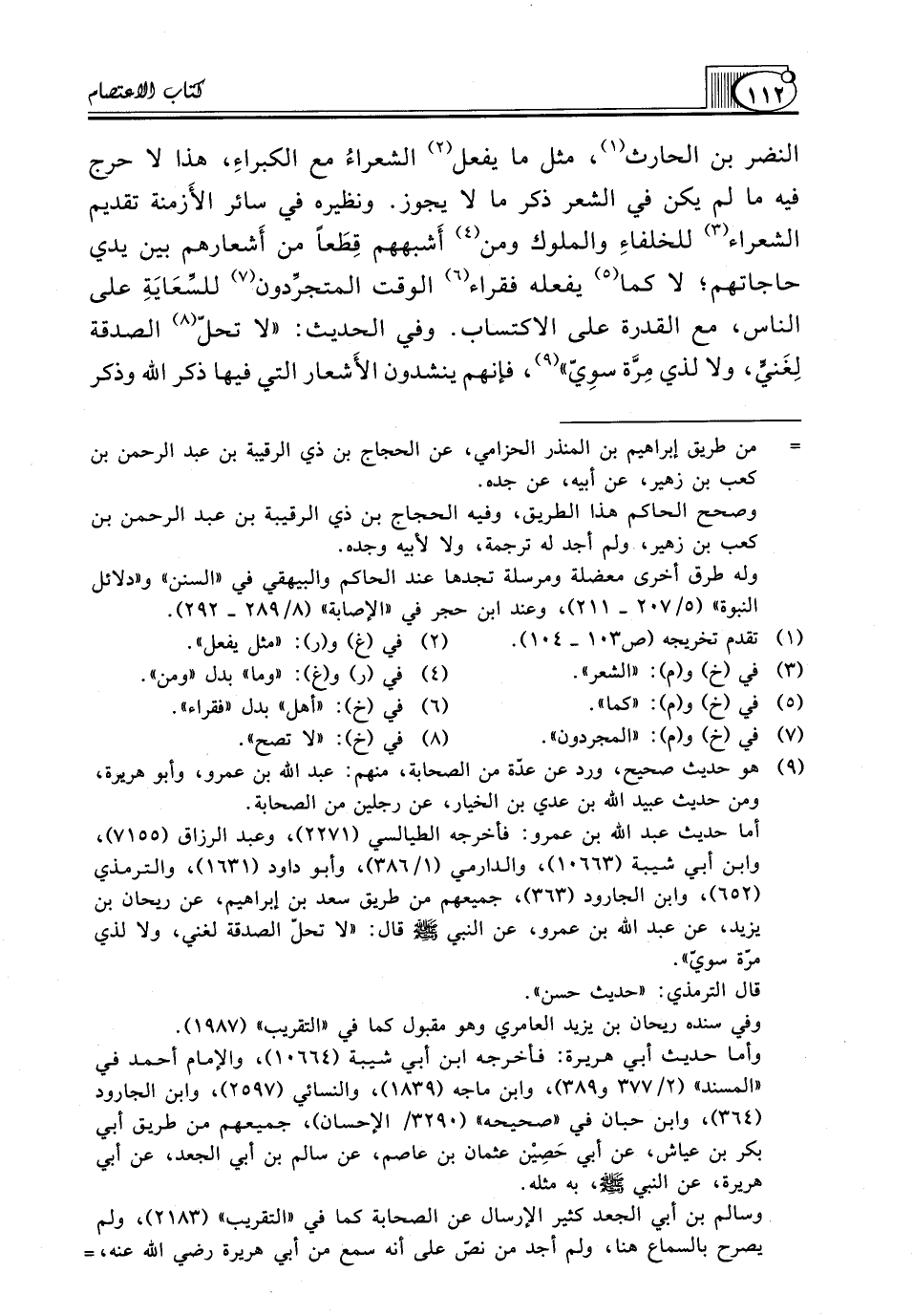 النضر بن الحارث (¬1)، مثل مَا يَفْعَلُ (¬2) الشعراءُ مَعَ الكبراءِ، هَذَا لَا حَرَجَ فِيهِ مَا لَمْ يَكُنْ فِي الشِّعْرِ ذِكْرُ مَا لَا يَجُوزُ. وَنَظِيرُهُ فِي سَائِرِ الأَزمنة تَقْدِيمُ الشُّعَرَاءِ (¬3) للخلفاءِ وَالْمُلُوكِ وَمَنْ (¬4) أَشبههم قِطَعاً من أَشعارهم بين يدي حاجاتهم؛ لا كما (¬5) يفعله فقراء (¬6) الوقت المتجرِّدون (¬7) للسِّعَايَةِ عَلَى النَّاسِ، مَعَ الْقُدْرَةِ عَلَى الِاكْتِسَابِ. وفي الحديث: "لا تحلّ (¬8) الصَّدَقَةُ لِغَنيٍّ، وَلَا لِذِي مِرَّة سوِيّ" (¬9)، فَإِنَّهُمْ يُنْشِدُونَ الأَشعار الَّتِي فِيهَا ذِكْرُ اللَّهِ وَذِكْرُ