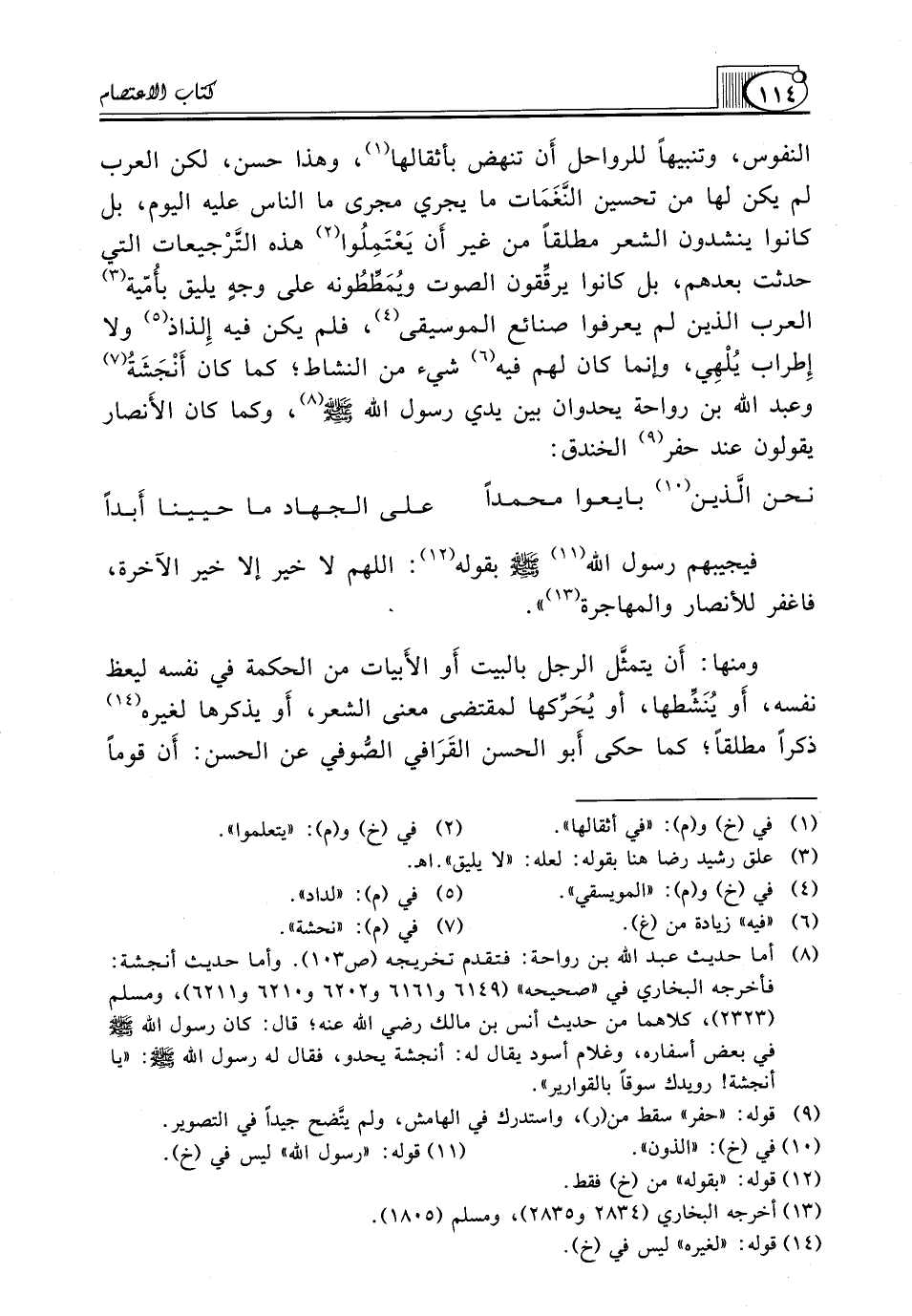 النفوس، وتنبيهاً للرواحل أَن تنهض بأثقالها (¬1)، وَهَذَا حَسَنٌ، لَكِنَّ الْعَرَبَ لَمْ يَكُنْ لَهَا مِنْ تَحْسِينِ النَّغَمَات مَا يَجْرِي مَجْرَى مَا النَّاسُ عَلَيْهِ الْيَوْمَ، بَلْ كَانُوا يُنْشِدُونَ الشِّعْرَ مطلقاً من غير أَن يَعْتَمِلُوا (¬2) هَذِهِ التَّرْجيعات الَّتِي حَدَثَتْ بِعَدَهُمْ، بَلْ كَانُوا يرقِّقون الصوت ويُمَطِّطُونه على وجهٍ يَلِيقُ بأُمّية (¬3) الْعَرَبِ الَّذِينَ لَمْ يَعْرِفُوا صَنَائِعَ الْمُوسِيقَى (¬4)، فَلَمْ يَكُنْ فِيهِ إِلذاذ (¬5) وَلَا إِطراب يُلْهِي، وإنما كان لهم فيه (¬6) شيء من النشاط؛ كما كان أَنْجَشَةُ (¬7) وَعَبْدُ اللَّهِ بْنُ رَوَاحَةَ يَحْدُوَانِ بَيْنَ يَدَيْ رَسُولِ اللَّهِ صَلَّى اللَّهُ عَلَيْهِ وَسَلَّمَ (¬8)، وَكَمَا كَانَ الأَنصار يَقُولُونَ عِنْدَ حَفْرِ (¬9) الْخَنْدَقِ: