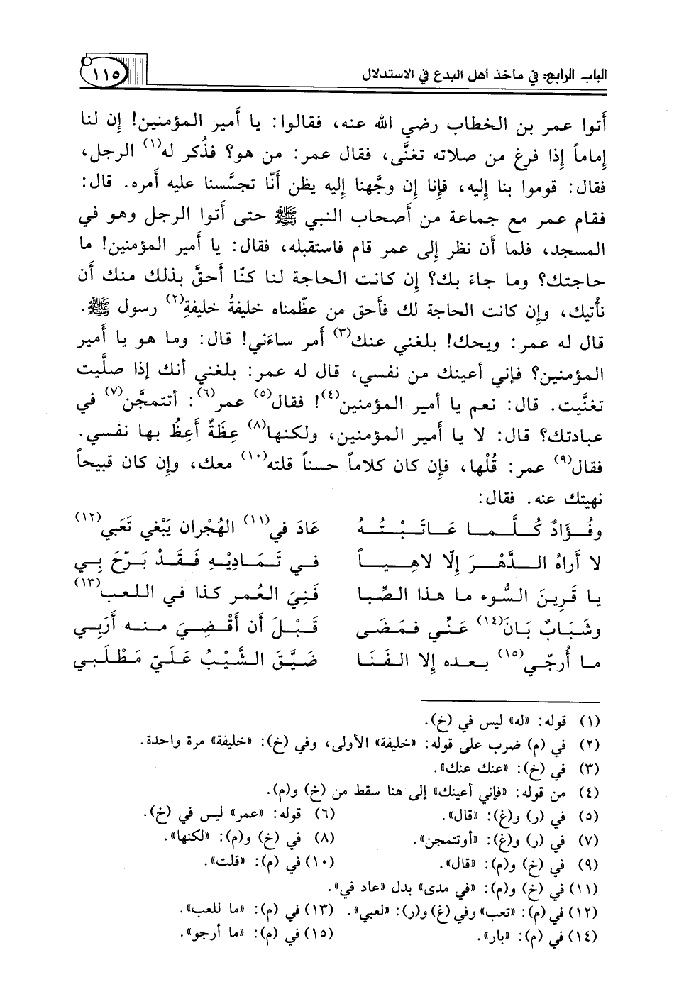 أَتوا عُمَرَ بْنَ الْخَطَّابِ رَضِيَ اللَّهُ عَنْهُ، فَقَالُوا: يَا أَمير الْمُؤْمِنِينَ! إِن لَنَا إِماماً إِذا فَرَغَ مِنْ صَلَاتِهِ تغنَّى، فَقَالَ عُمَرُ: مَنْ هُوَ؟ فذُكر لَهُ (¬1) الرَّجُلُ، فَقَالَ: قُومُوا بِنَا إِليه، فإِنا إِن وجَّهنا إِليه يَظُنُّ أَنّا تجسَّسنا عَلَيْهِ أَمره. قَالَ: فَقَامَ عُمَرُ مَعَ جَمَاعَةٍ مِنْ أَصحاب النَّبِيِّ صَلَّى اللَّهُ عَلَيْهِ وَسَلَّمَ حَتَّى أَتوا الرَّجُلَ وَهُوَ فِي الْمَسْجِدِ، فَلَمَّا أَن نَظَرَ إِلى عُمَرَ قَامَ فَاسْتَقْبَلَهُ، فَقَالَ: يَا أَمير الْمُؤْمِنِينَ! مَا حَاجَتُكَ؟ وَمَا جاءَ بِكَ؟ إِن كَانَتِ الْحَاجَةُ لَنَا كُنَّا أَحقَّ بِذَلِكَ مِنْكَ أَن نأْتيك، وإِن كَانَتِ الْحَاجَةُ لَكَ فأَحق مَنْ عَظَّمْنَاهُ خليفةُ خليفةِ (¬2) رسول صَلَّى اللَّهُ عَلَيْهِ وَسَلَّمَ. قَالَ لَهُ عُمَرُ: وَيَحَكَ! بَلَغَنِي عَنْكَ (¬3) أَمر ساءَني! قَالَ: وَمَا هو يا أَمير المؤمنين؟ فإني أعينك من نفسي، قال له عمر: بلغني أنك إذا صلَّيت تغنَّيت. قال: نعم يا أمير المؤمنين (¬4)! فقال (¬5) عمر (¬6): أتتمجَّن (¬7) فِي عِبَادَتِكَ؟ قَالَ: لَا يَا أَمير المؤمنين، ولكنها (¬8) عِظَةٌ أَعِظُ بها نفسي. فقال (¬9) عُمَرُ: قُلْها، فإِن كَانَ كَلَامًا حَسَنًا قُلْتُهُ (¬10) مَعَكَ، وإِن كَانَ قَبِيحًا نَهَيْتُكَ عَنْهُ. فَقَالَ: