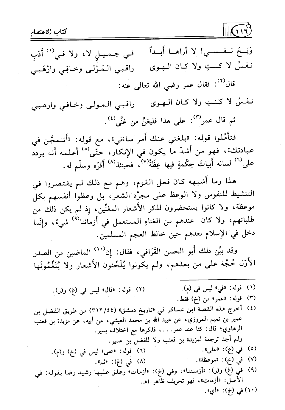 وَقَدْ بيَّن ذَلِكَ أَبو الْحَسَنِ القَرَافي، فَقَالَ: إِن (¬10) الْمَاضِينَ مِنَ الصَّدْرِ الأَوّل حُجَّة عَلَى مَنْ بَعْدَهُمْ، وَلَمْ يَكُونُوا يُلَحِّنون الأَشعار وَلَا يُنَغِّمُونَها