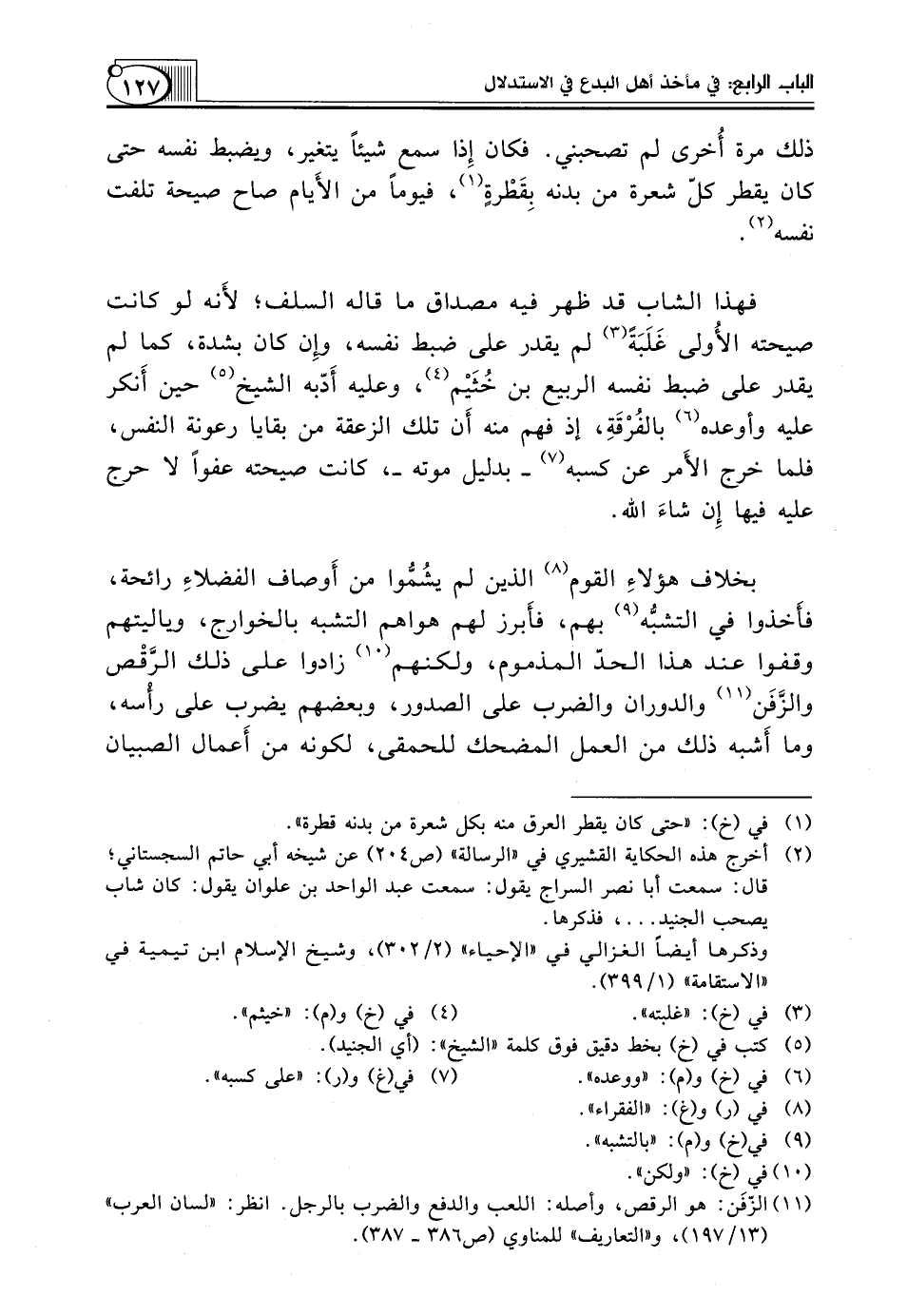 بِخِلَافِ هؤلاءِ الْقَوْمِ (¬8) الَّذِينَ لَمْ يشُمُّوا مِنْ أَوصاف الفضلاءِ رائحة، فأَخذوا في التشبُّه (¬9) بهم، فأَبرز لهم هواهم التشبه بالخوارج، وياليتهم وقفوا عند هذا الحدّ المذموم، ولكنهم (¬10) زادوا على ذلك الرَّقْص والزَّفَن (¬11) وَالدَّوَرَانَ وَالضَّرْبَ عَلَى الصُّدُورِ، وَبَعْضُهُمْ يَضْرِبُ عَلَى رأْسه، وَمَا أَشبه ذَلِكَ مِنَ الْعَمَلِ الْمُضْحِكِ للحمقى، لكونه من أَعمال الصبيان