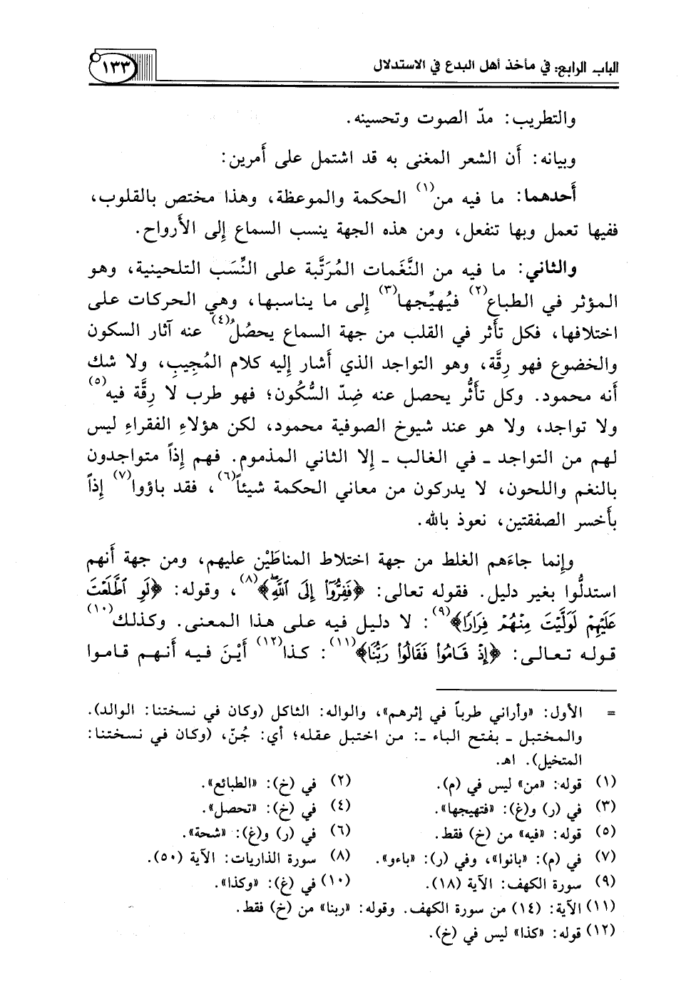 وَالثَّانِي: مَا فِيهِ مِنَ النَّغَمات المُرَتَّبة عَلَى النِّسَب التَّلْحِينِيَّةِ، وَهُوَ الْمُؤَثِّرُ فِي الطِّبَاعِ (¬2) فيُهيِّجها (¬3) إِلى مَا يُنَاسِبُهَا، وَهِيَ الْحَرَكَاتُ عَلَى اخْتِلَافِهَا، فَكُلُّ تأَثر في القلب من جهة السماع يحصُلُ (¬4) عنه آثار السكون وَالْخُضُوعِ فَهُوَ رِقَّة، وَهُوَ التَّوَاجُدُ الَّذِي أَشار إِليه كَلَامُ المُجِيبِ، وَلَا شَكَّ أَنه مَحْمُودٌ. وَكُلُّ تأَثُّر يَحْصُلُ عَنْهُ ضِدّ السُّكُون؛ فَهُوَ طَرَبٌ لَا رِقَّة فِيهِ (¬5) وَلَا تَوَاجُدَ، وَلَا هُوَ عِنْدَ شُيُوخِ الصُّوفِيَّةِ مَحْمُودٌ، لَكِنَّ هؤلاءِ الفقراءِ لَيْسَ لَهُمْ مِنَ التَّوَاجُدِ ـ فِي الْغَالِبِ ـ إِلا الثَّانِي الْمَذْمُومَ. فَهُمْ إِذاً مُتَوَاجِدُونَ بِالنَّغَمِ وَاللُّحُونِ، لَا يُدْرِكُونَ مِنْ مَعَانِي الْحِكْمَةِ شَيْئًا (¬6)، فَقَدْ بَاؤُوا (¬7) إِذاً بأَخسر الصَّفْقَتَيْنِ، نَعُوذُ بِاللَّهِ.