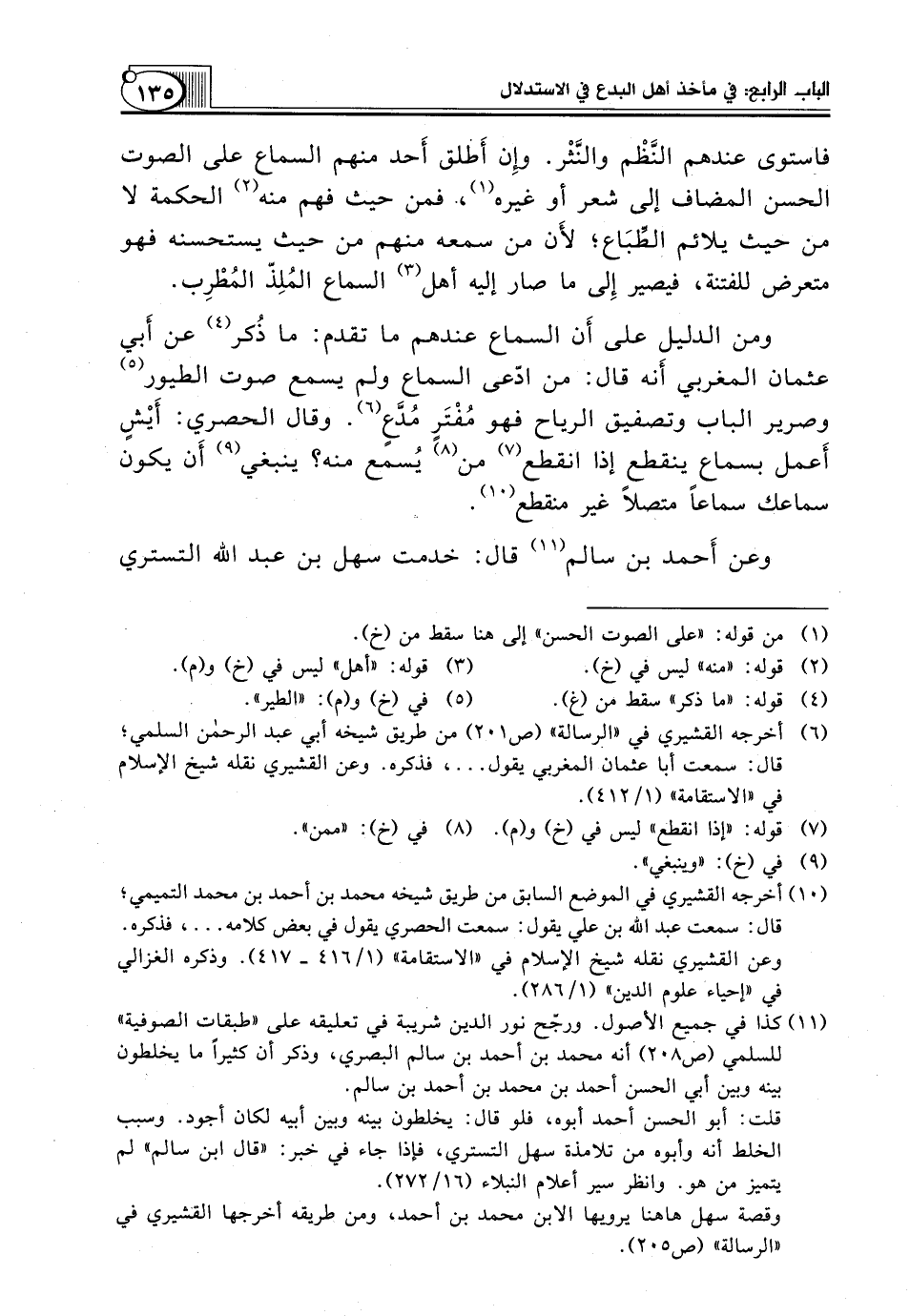فَاسْتَوَى عِنْدَهُمُ النَّظْم والنَّثْر. وإِن أَطلق أَحد مِنْهُمُ السَّمَاعَ عَلَى الصَّوْتِ الْحَسَنِ الْمُضَافِ إِلَى شعر أو غيره (¬1)، فمن حيث فهم منه (¬2) الْحِكْمَةَ لَا مِنْ حَيْثُ يُلَائِمُ الطِّبَاع؛ لأَن من سمعه منهم مِنْ حَيْثُ يَسْتَحْسِنُهُ فَهُوَ مُتَعَرِّضٌ لِلْفِتْنَةِ، فَيَصِيرُ إِلى ما صار إليه أهل (¬3) السَّمَاعُ المُلِذّ المُطْرِب.