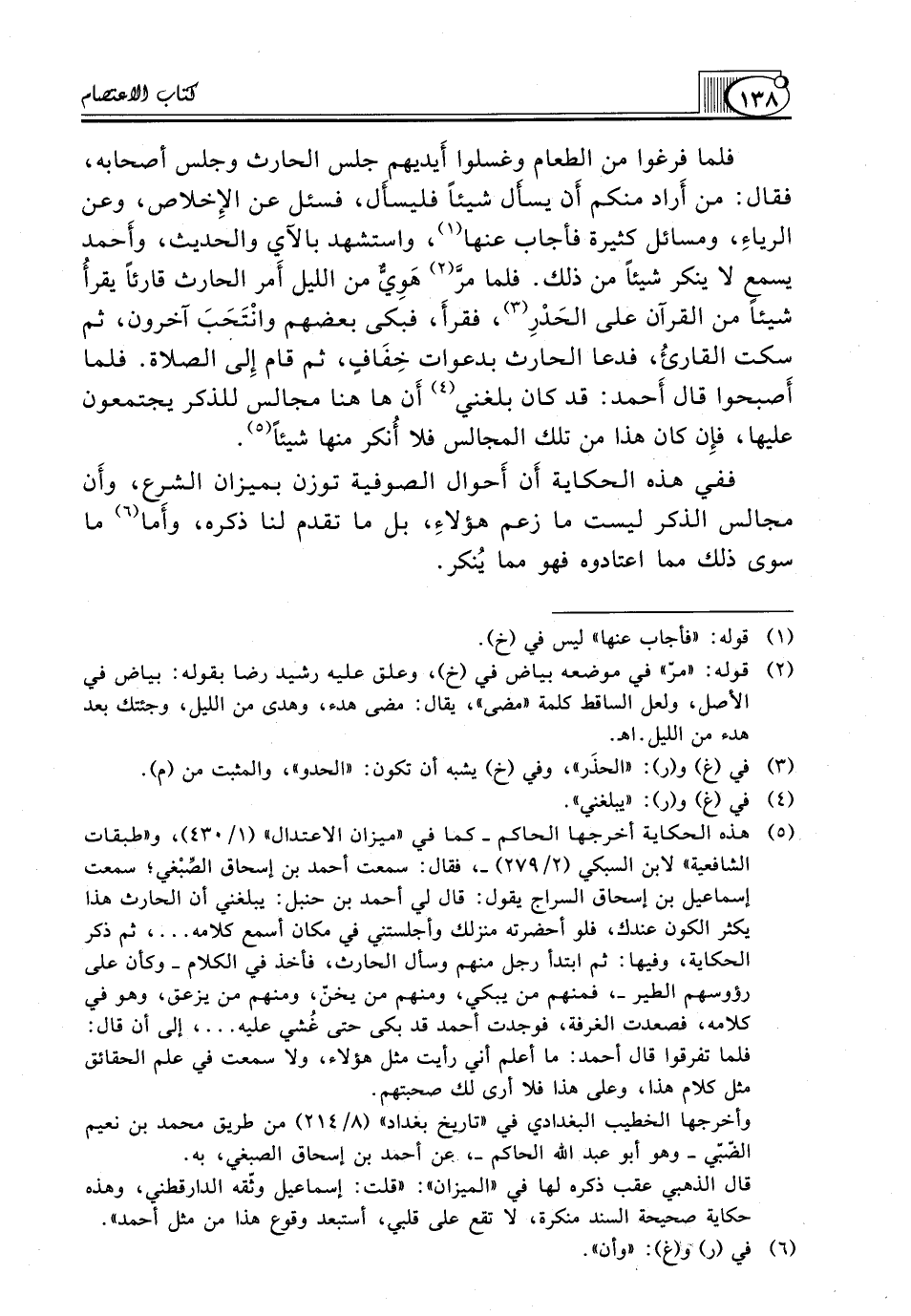 (¬5) هذه الحكاية أخرجها الحاكم ـ كما في "ميزان الاعتدال" (1/ 430)، و"طبقات الشافعية" لابن السبكي (2/ 279) ـ، فقال: سمعت أحمد بن إسحاق الصِّبْغي؛ سمعت إسماعيل بن إسحاق السراج يقول: قال لي أحمد بن حنبل: يبلغني أن الحارث هذا يكثر الكون عندك، فلو أحضرته منزلك وأجلستني في مكان أسمع كلامه ... ، ثم ذكر الحكاية، وفيها: ثم ابتدأ رجل منهم وسأل الحارث، فأخذ في الكلام ـ وكأن على رؤوسهم الطير ـ، فمنهم من يبكي، ومنهم من يخنّ، ومنهم من يزعق، وهو في كلامه، فصعدت الغرفة، فوجدت أحمد قد بكى حتى غُشي عليه ... ، إلى أن قال: فلما تفرقوا قال أحمد: ما أعلم أني رأيت مثل هؤلاء، ولا سمعت في علم الحقائق مثل كلام هذا، وعلى هذا فلا أرى لك صحبتهم.