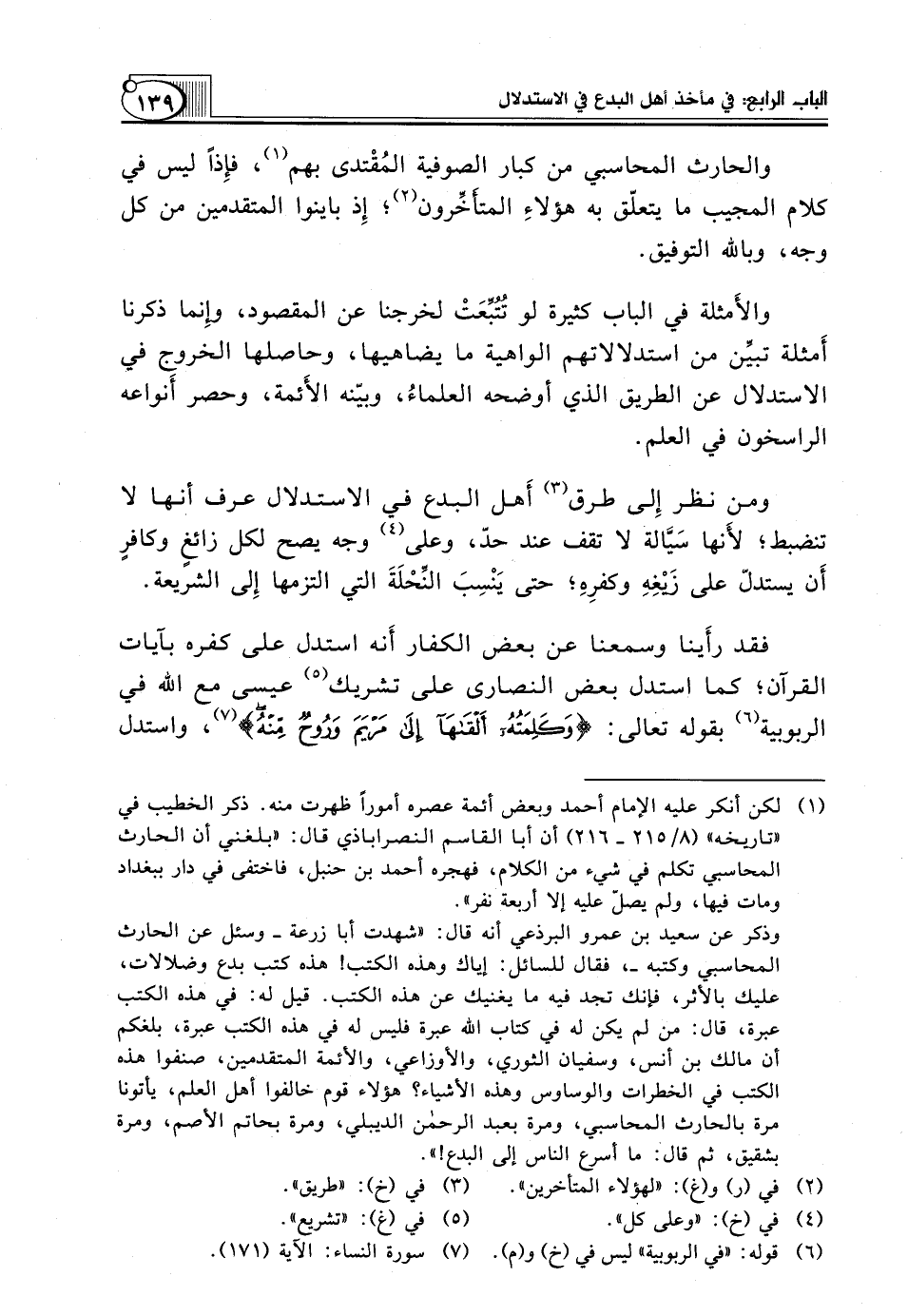 وَالْحَارِثُ الْمُحَاسَبِيُّ مِنْ كِبَارِ الصُّوفِيَّةِ المُقْتدى بِهِمْ (¬1)، فإِذاً لَيْسَ فِي كَلَامِ الْمُجِيبِ مَا يَتَعَلَّقُ بِهِ هؤلاءِ المتأَخِّرون (¬2)؛ إِذ بَايَنُوا الْمُتَقَدِّمِينَ مِنْ كُلِّ وَجْهٍ، وَبِاللَّهِ التَّوْفِيقُ.