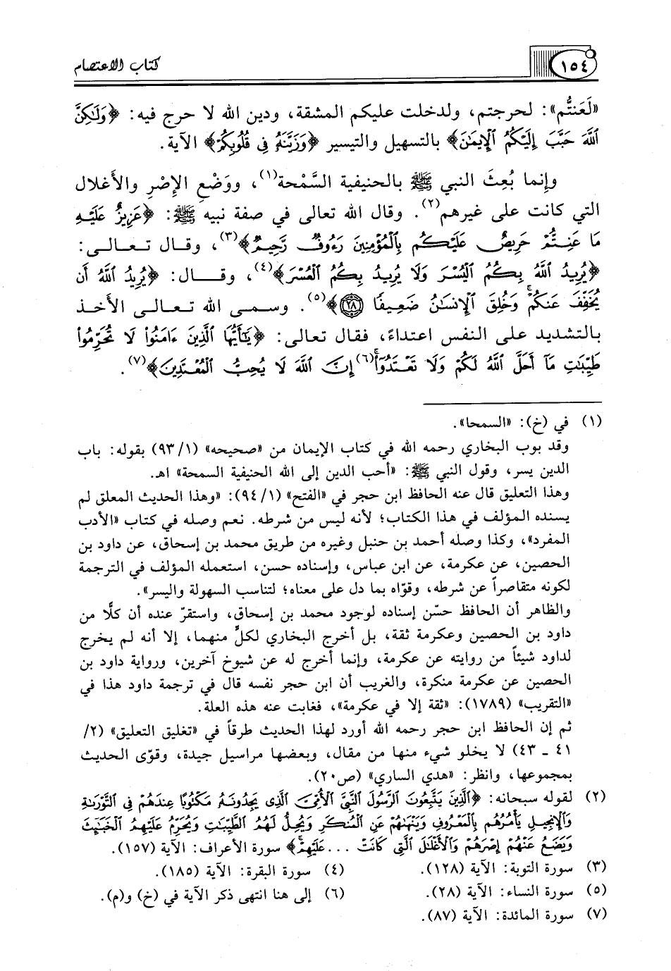 وقد بوب البخاري رحمه الله في كتاب الإيمان من "صحيحه" (1/ 93) بقوله: باب الدين يسر، وقول النبي صلّى الله عليه وسلّم: "أحب الدين إلى الله الحنيفية السمحة" اهـ.