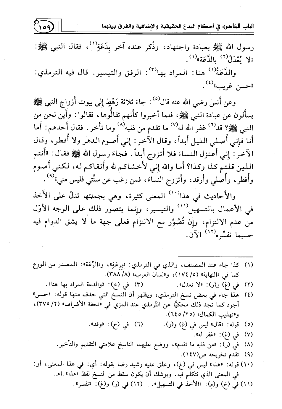 وَعَنْ أَنس رَضِيَ اللَّهُ عَنْهُ قَالَ (¬5): جاءَ ثَلَاثَةُ رَهْطٍ إِلى بُيُوتِ أَزواج النَّبِيِّ صَلَّى اللَّهُ عَلَيْهِ وَسَلَّمَ يسأَلون عَنْ عِبَادَةِ النَّبِيِّ صَلَّى اللَّهُ عَلَيْهِ وَسَلَّمَ، فَلَمَّا أُخْبِرُوا كأَنهم تقالُّوها، فَقَالُوا: وأَين نَحْنُ مِنَ النَّبِيِّ صَلَّى الله عليه وسلّم؟ قد (¬6) غَفَرَ اللَّهُ لَهُ (¬7) مَا تَقَدَّمَ مِنْ ذَنْبِهِ (¬8) وَمَا تأَخر. فَقَالَ أَحدهم: أَما أَنا فإِني أُصلي اللَّيْلَ أَبداً، وَقَالَ الْآخَرُ: إِني أَصوم الدَّهْرَ وَلَا أُفطر، وَقَالَ الْآخَرُ: إِني أَعتزل النساءَ فَلَا أَتزوج أَبداً. فجاءَ رَسُولُ اللَّهِ صَلَّى اللَّهُ عَلَيْهِ وَسَلَّمَ فَقَالَ: "أَنتم الَّذِينَ قُلْتُمْ كَذَا وَكَذَا؟ أَما وَاللَّهِ إِني لأَخشاكم لِلَّهِ وأَتقاكم لَهُ، لَكِنِّي أَصوم وأُفطر، وأُصلي وأَرقد، وأَتزوج النساءَ، فَمَنْ رَغِبَ عَنْ سنَّتي فَلَيْسَ مِنِّي" (¬9).