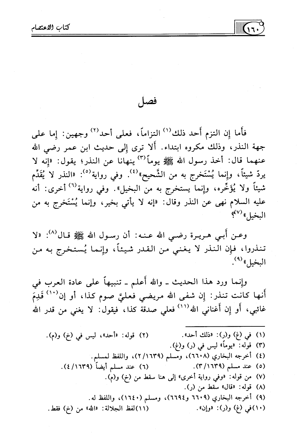 فأَما إِن الْتَزَمَ أَحد ذَلِكَ (¬1) الْتِزَامًا، فعلى أحد (¬2) وَجْهَيْنِ: إِما عَلَى جِهَةِ النَّذْرِ، وَذَلِكَ مَكْرُوهٌ ابْتِدَاءً. أَلا تَرَى إِلى حَدِيثِ ابْنِ عُمَرَ رَضِيَ اللَّهُ عَنْهُمَا قَالَ: أَخَذَ رَسُولُ اللَّهِ صَلَّى اللَّهُ عَلَيْهِ وَسَلَّمَ يَوْمًا (¬3) يَنْهَانَا عَنِ النَّذْرِ؛ يَقُولُ: "إِنه لَا يَرُدُّ شَيْئًا، وإِنما يُسْتَخرج بِهِ مِنَ الشَّحيح" (¬4). وَفِي رِوَايَةٍ (¬5): "النَّذْرُ لَا يُقَدِّم شَيْئًا وَلَا يُؤَخِّره، وإِنما يُسْتَخْرَجُ به من البخيل". وفي رواية (¬6) أخرى: أنه عليه السلام نهى عن النذر وقال: "إنه لا يأتي بخير، وَإِنَّمَا يُسْتَخرج بِهِ مِنَ الْبَخِيلِ" (¬7)؟