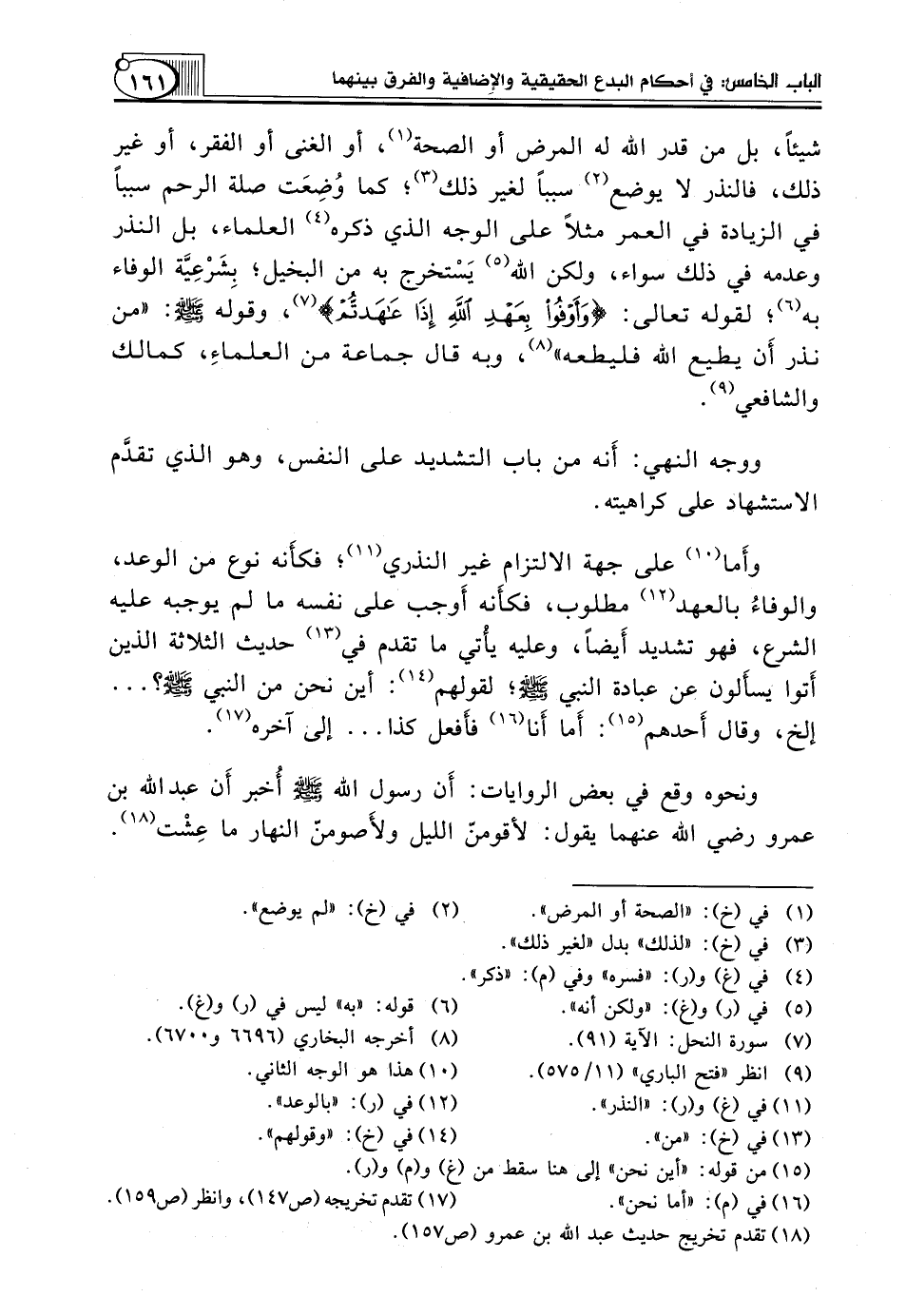 وأَما (¬10) عَلَى جِهَةِ الِالْتِزَامِ غَيْرِ النَّذْرِيِّ (¬11)؛ فكأَنه نَوْعٌ مِنَ الْوَعْدِ، والوفاءُ بِالْعَهْدِ (¬12) مَطْلُوبٌ، فكأَنه أَوجب عَلَى نَفْسِهِ مَا لَمْ يُوجِبْهُ عَلَيْهِ الشَّرْعُ، فَهُوَ تَشْدِيدٌ أَيضاً، وَعَلَيْهِ يأْتي مَا تقدم في (¬13) حَدِيثِ الثَّلَاثَةِ الَّذِينَ أَتوا يسأَلون عَنْ عِبَادَةِ النَّبِيِّ صَلَّى اللَّهُ عَلَيْهِ وَسَلَّمَ؛ لِقَوْلِهِمْ (¬14): أَيْنَ نَحْنُ مِنَ النَّبِيِّ صَلَّى اللَّهُ عَلَيْهِ وَسَلَّمَ؟ ... إِلَخْ، وَقَالَ أَحدهم (¬15): أَما أَنا (¬16) فأَفعل كَذَا ... إلى آخره (¬17).