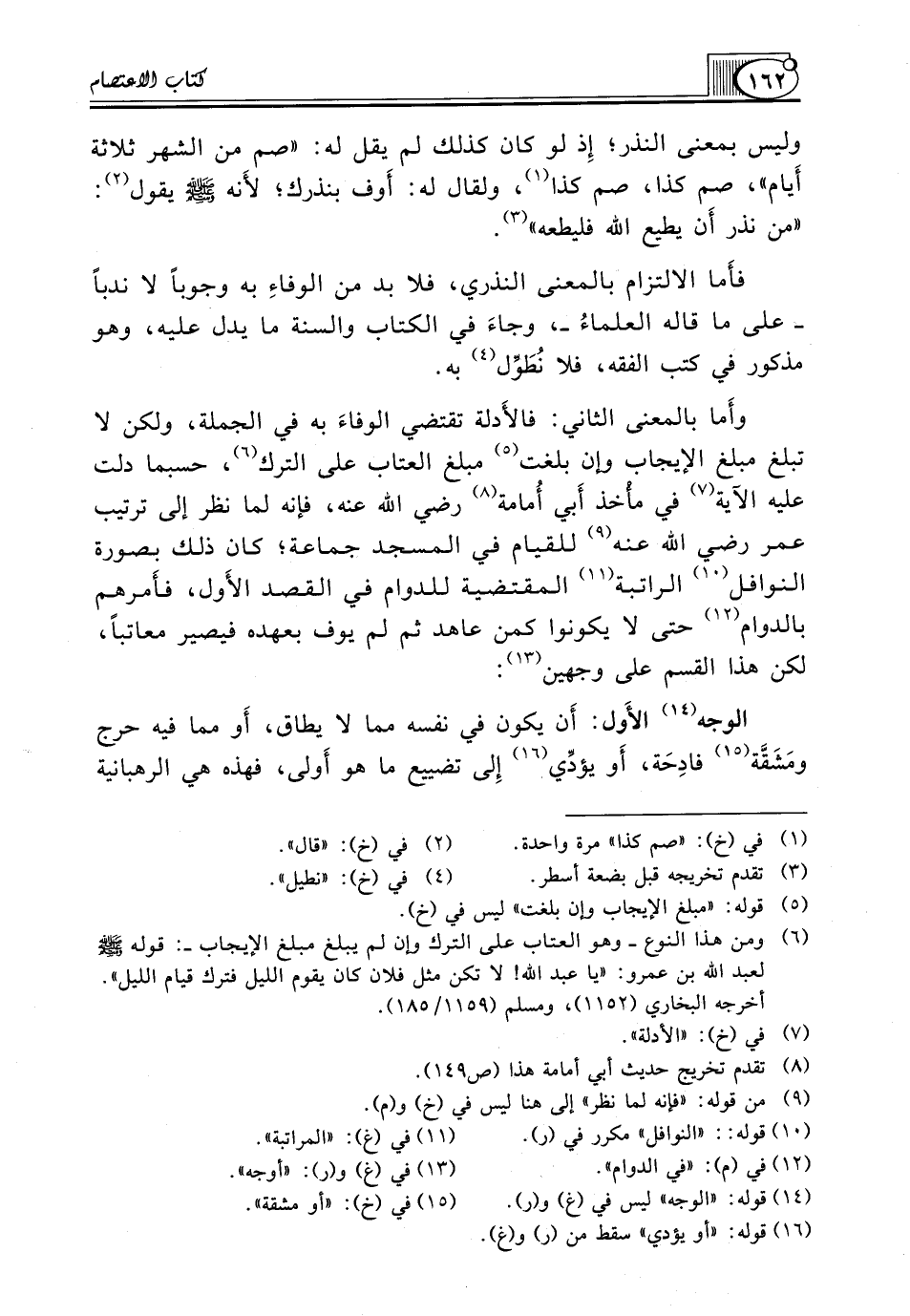 فأَما الِالْتِزَامُ بِالْمَعْنَى النَّذْرِيِّ، فَلَا بُدَّ مِنَ الوفاءِ بِهِ وُجُوبًا لَا نَدْبًا ـ عَلَى مَا قَالَهُ العلماءُ ـ، وجاءَ فِي الْكِتَابِ وَالسُّنَّةِ مَا يَدُلُّ عَلَيْهِ، وَهُوَ مَذْكُورٌ فِي كُتُبِ الْفِقْهِ، فَلَا نُطَوِّل (¬4) به.
