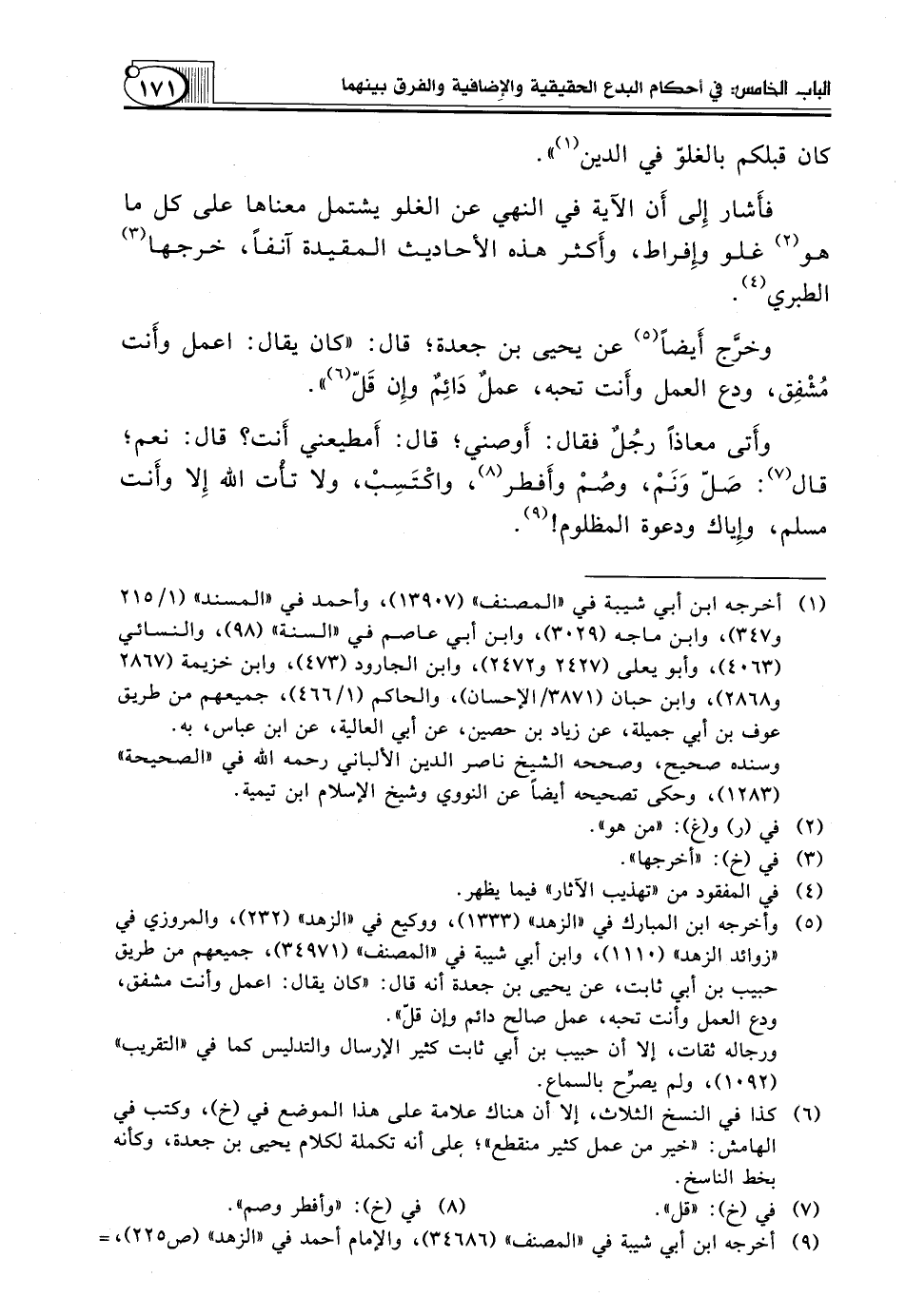 (¬6) كذا في النسخ الثلاث، إلا أن هناك علامة على هذا الموضع في (خ)، وكتب في الهامش: "خير من عمل كثير منقطع"؛ على أنه تكملة لكلام يحيى بن جعدة، وكأنه بخط الناسخ.