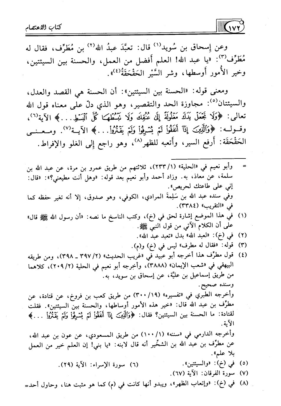 وعن إِسحاق بن سُويد (¬1) قال: تعبَّدَ عبدُ الله (¬2) بن مُطَرِّف، فقال له مُطَرِّف (¬3): "يَا عَبْدَ اللَّهِ! الْعِلْمُ أَفضل مِنَ الْعَمَلِ، وَالْحَسَنَةُ بَيْنَ السَّيِّئَتَيْنِ، وَخَيْرُ الأُمور أَوسطها، وشر السَّيْر الحَقْحَقَةُ (¬4) ".