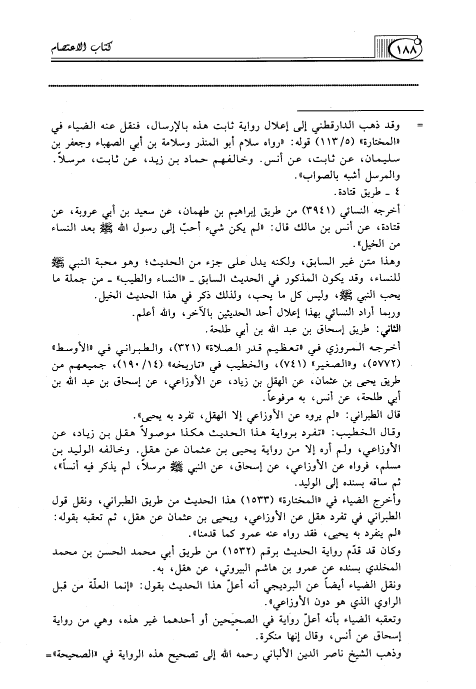 =وقد ذهب الدارقطني إلى إعلال رواية ثابت هذه بالإرسال، فنقل عنه الضياء في "المختارة" (5/ 113) قوله: "رواه سلام أبو المنذر وسلامة بن أبي الصهباء وجعفر بن سليمان، عن ثابت، عن أنس. وخالفهم حماد بن زيد، عن ثابت، مرسلاً. والمرسل أشبه بالصواب".