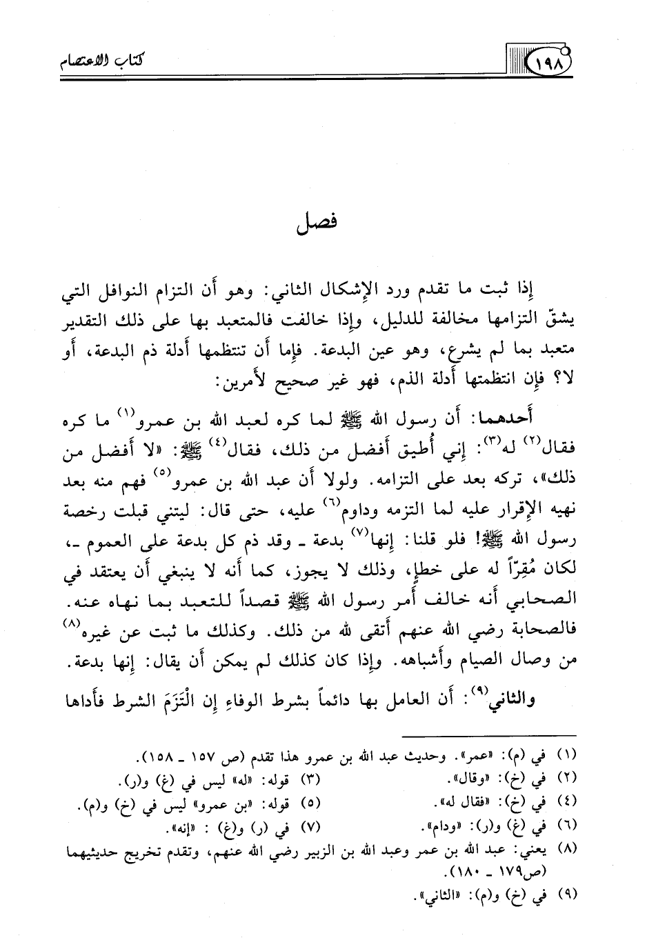 أَحدهما: أَن رَسُولَ اللَّهِ (ص) لَمَّا كَرِهَ لِعَبْدِ اللَّهِ بْنِ عَمْرٍو (¬1) مَا كره فقال (¬2) لَهُ (¬3): إِني أُطيق أَفضل مِنْ ذَلِكَ، فَقَالَ (¬4) صَلَّى اللَّهُ عَلَيْهِ وَسَلَّمَ: "لَا أَفضل مِنْ ذَلِكَ"، تَرَكَهُ بَعْدُ عَلَى الْتِزَامِهِ. وَلَوْلَا أَن عبد الله بن عمرو (¬5) فَهِمَ مِنْهُ بَعْدَ نَهْيِهِ الإِقرار عَلَيْهِ لَمَا الْتَزَمَهُ وَدَاوَمَ (¬6) عَلَيْهِ، حَتَّى قَالَ: لَيْتَنِي قَبِلْتُ رخصة رسول الله صلى الله عليه وسلم! فَلَوْ قُلْنَا: إِنها (¬7) بِدْعَةٌ ـ وَقَدْ ذُمَّ كُلُّ بِدْعَةٍ عَلَى الْعُمُومِ ـ، لَكَانَ مُقِرّاً لَهُ عَلَى خطإٍ، وَذَلِكَ لَا يَجُوزُ، كَمَا أَنه لَا يَنْبَغِي أَن يُعْتَقَدَ فِي الصَّحَابِيِّ أَنه خَالَفَ أَمر رسول الله صلى الله عليه وسلم قَصْدًا لِلتَّعَبُّدِ بِمَا نَهَاهُ عَنْهُ. فَالصَّحَابَةُ رَضِيَ اللَّهُ عَنْهُمْ أَتقى لِلَّهِ مِنْ ذَلِكَ. وَكَذَلِكَ مَا ثَبَتَ عَنْ غَيْرِهِ (¬8) مِنْ وِصَالِ الصِّيَامِ وأَشباهه. وإِذا كَانَ كَذَلِكَ لَمْ يُمْكِنْ أَن يقال: إِنها بدعة.